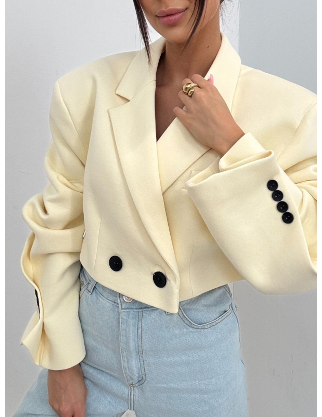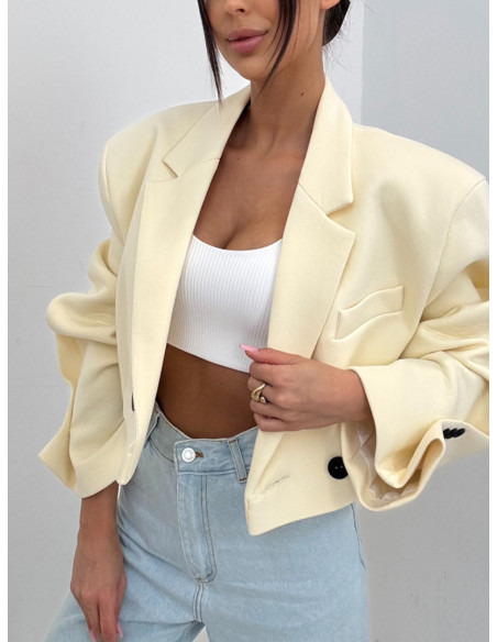 Krótka marynarka oversize w kolorze bananowym to synonim szyku i wszechstronności.