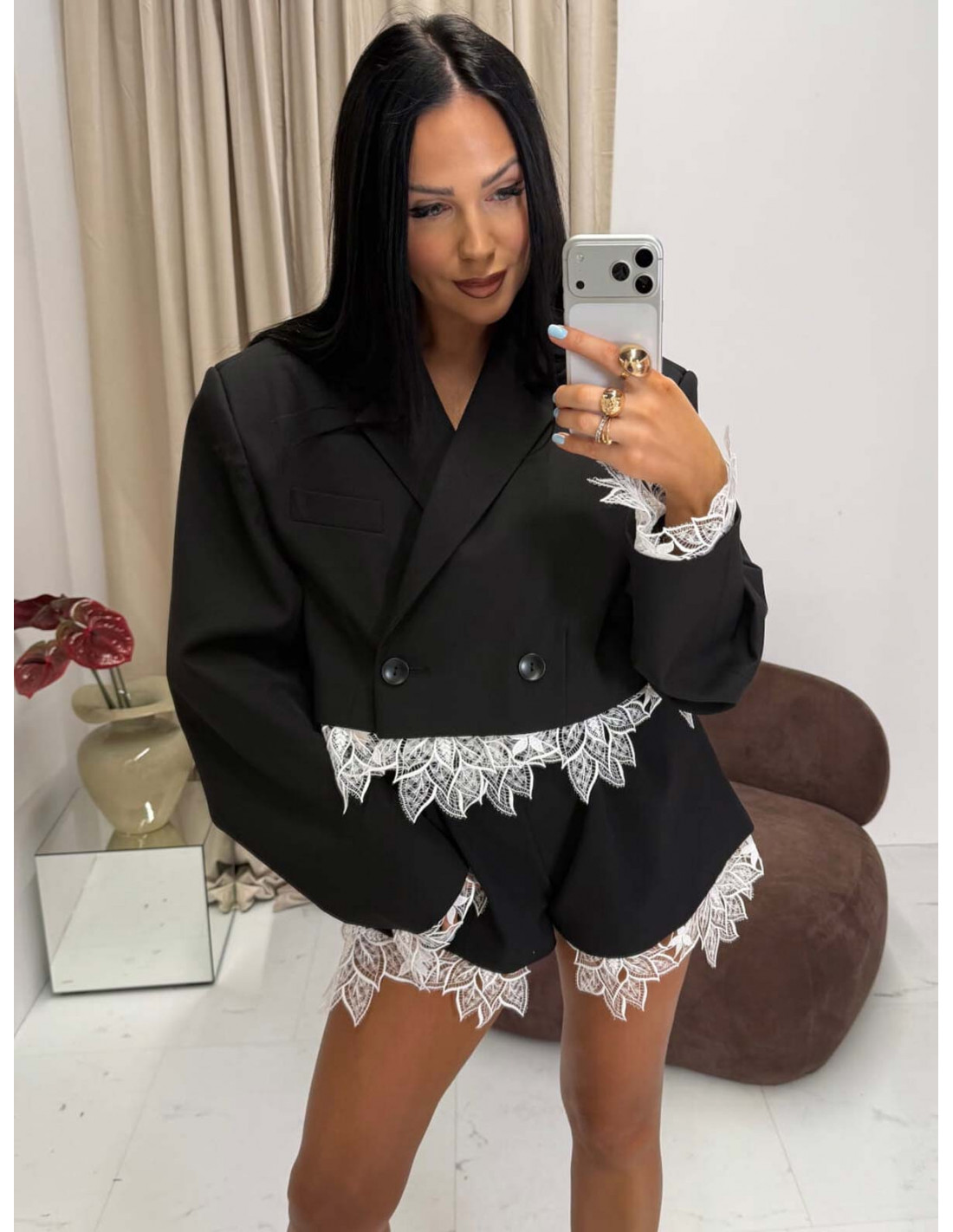 Model zachwyca detalami – dół i rękawy wykończone koronką nadają całości wyjątkowego, kobiecego wyrazu i nuty luksusu.