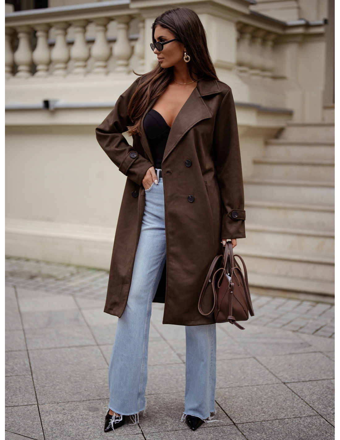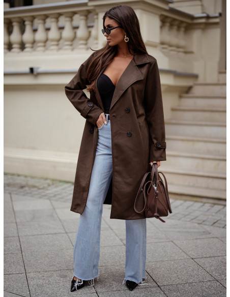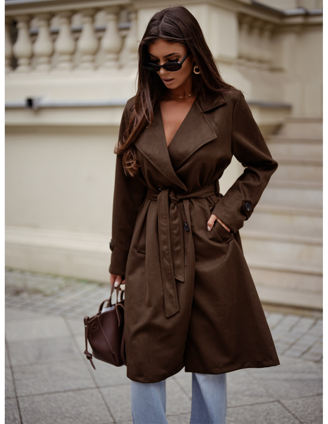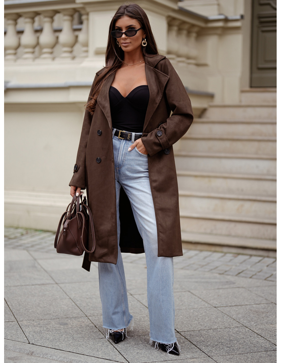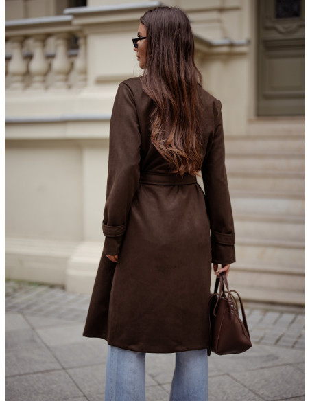 Stylowy zamszowy płaszcz z paskiem CYNDI - czekoladowy