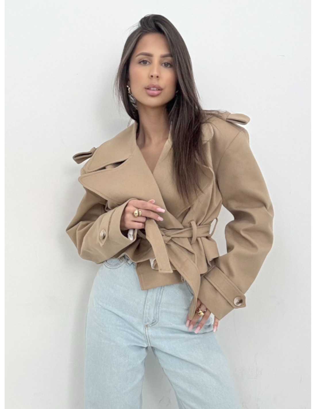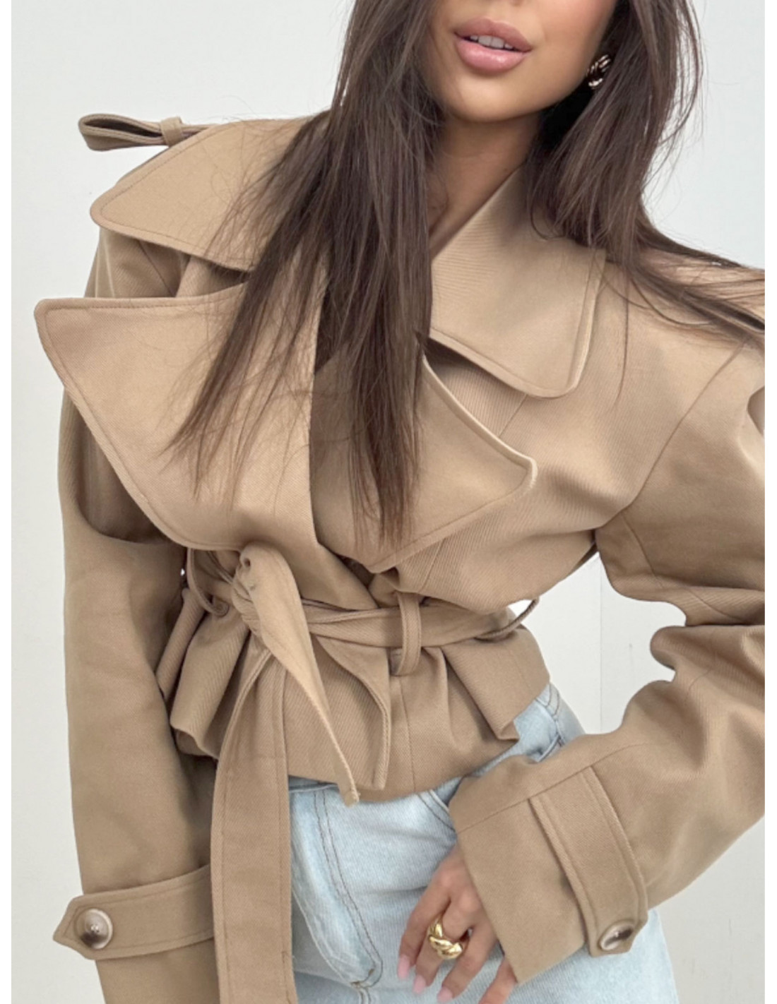 Model inspirowany fasonem, jaki ma klasyczny trencz, zachwyca szerokimi klapami i dopracowanymi detalami na ramionach.