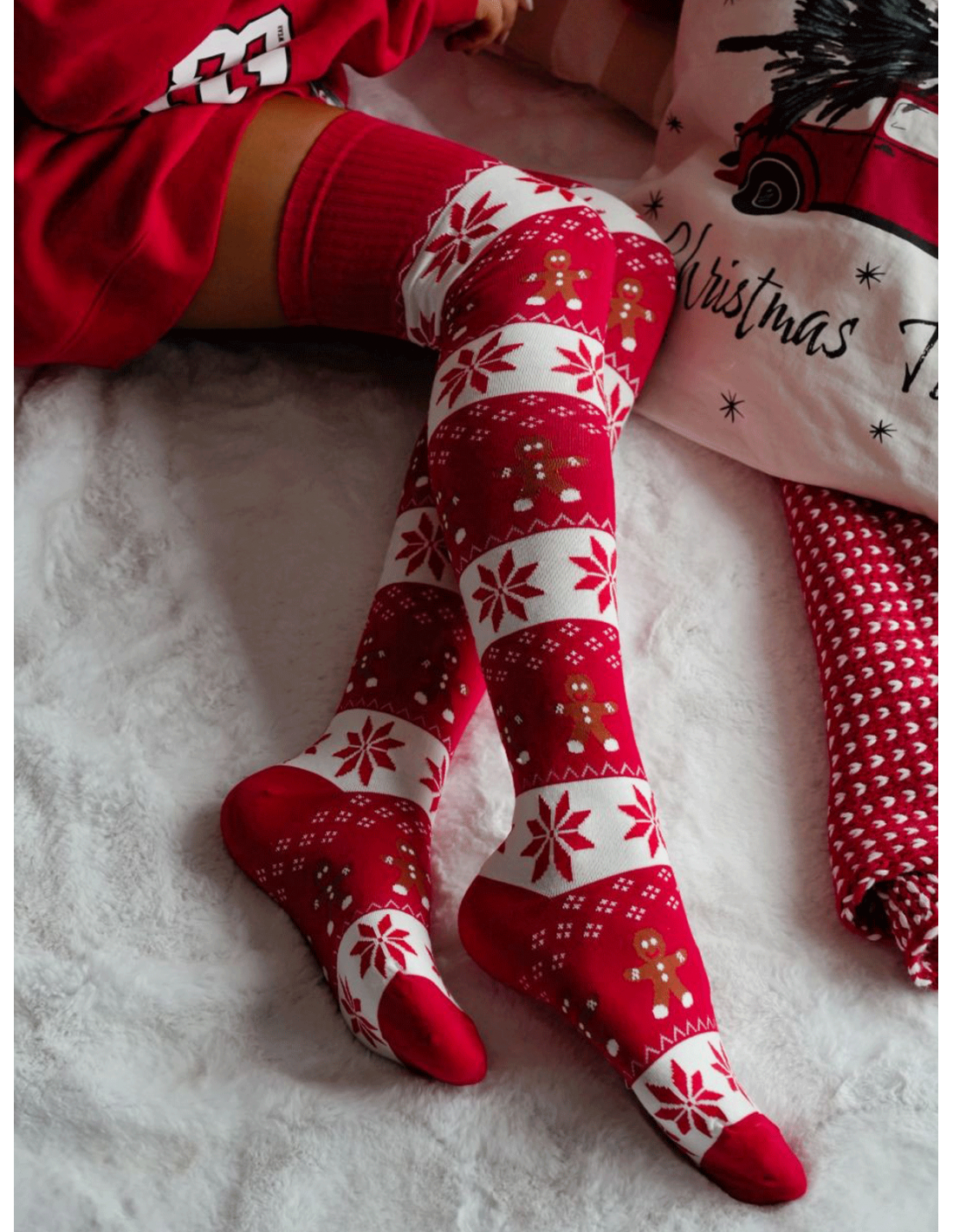 Elastyczny materiał doskonale dopasowuje się do nogi, a uroczy design przyciąga uwagę i wprowadza w świąteczny nastrój.