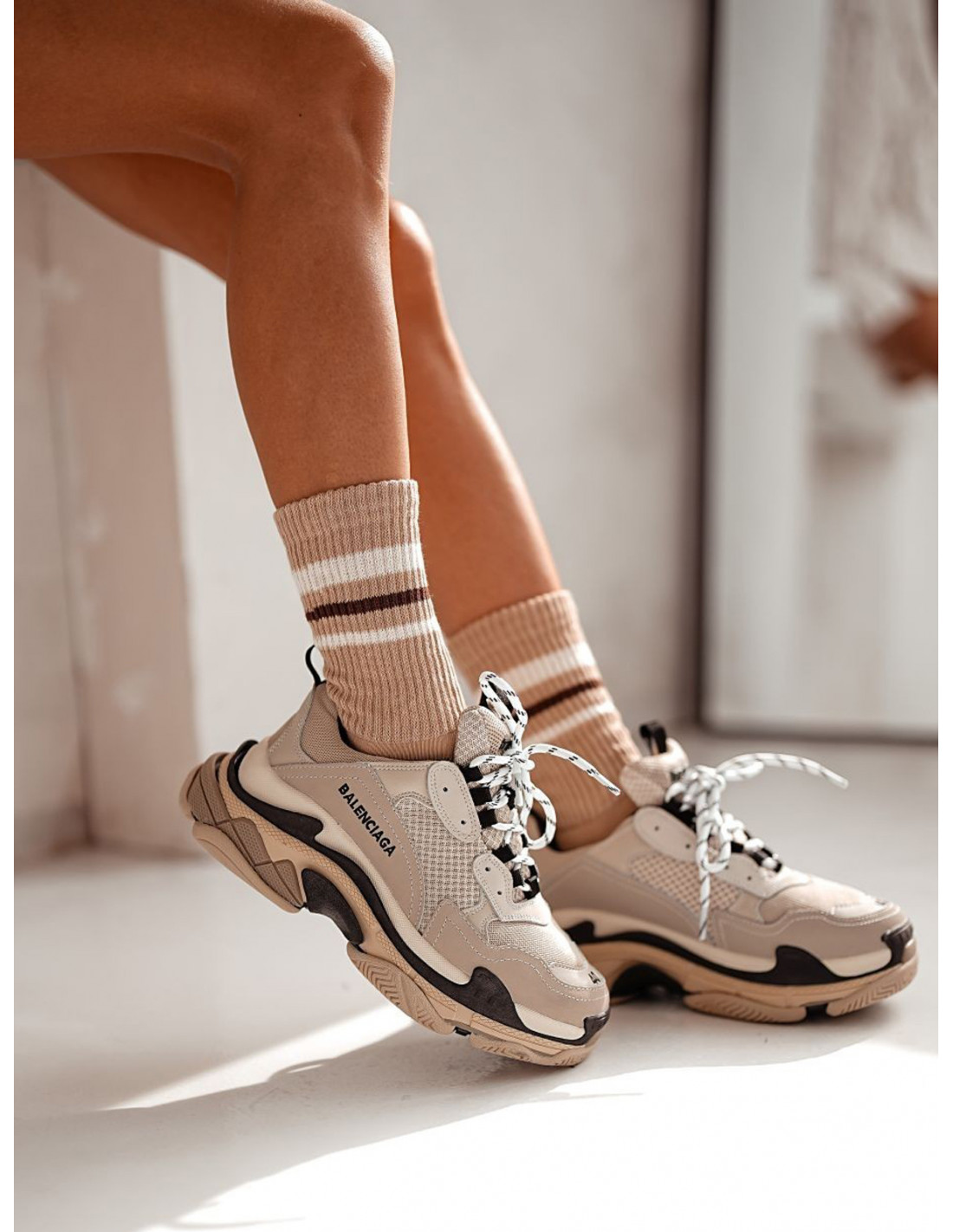 Te skarpetki w kolorze beżowym świetnie komponują się ze sneakersami, jeansami lub dresami, dodając stylizacji modowego, miejskiego charakteru.