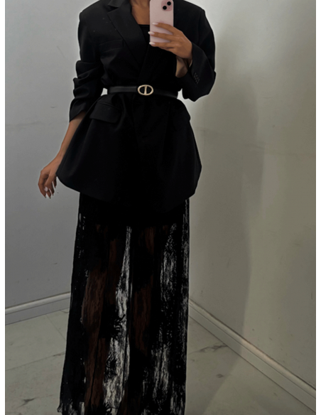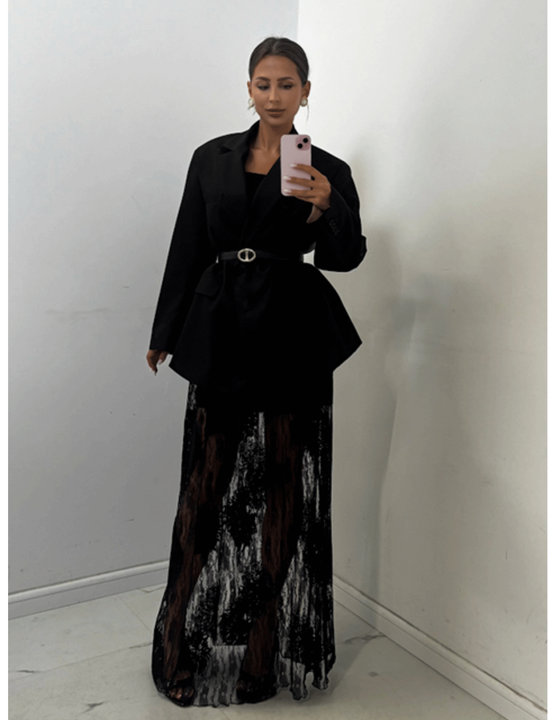 Jej półprzezroczysty materiał subtelnie odsłania nogi, dodając całości nuty tajemniczości i elegancji.