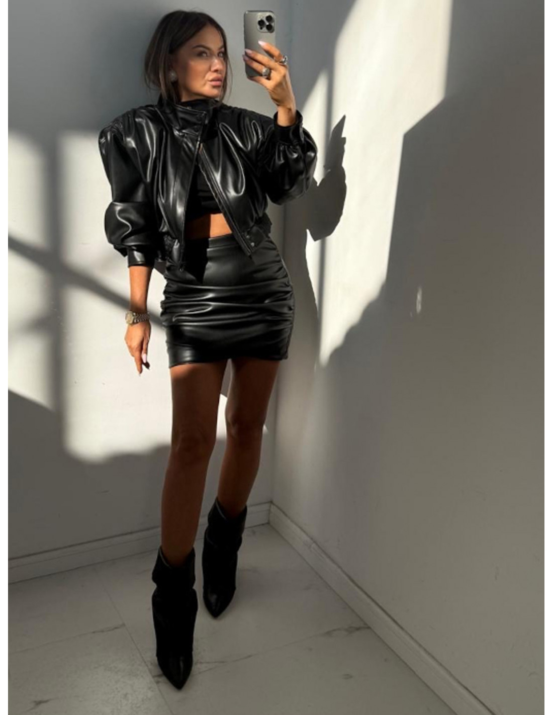 Dopasowana spódnica mini z ekoskóry AIDEN to kwintesencja kobiecej pewności siebie i nowoczesnego stylu.