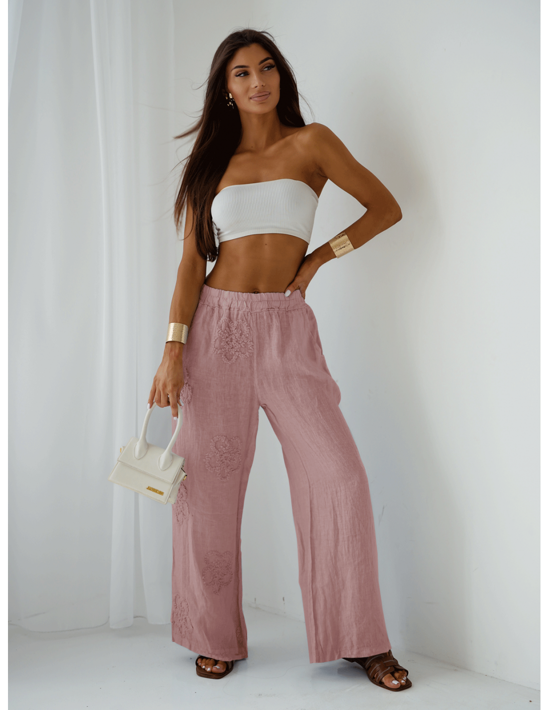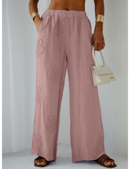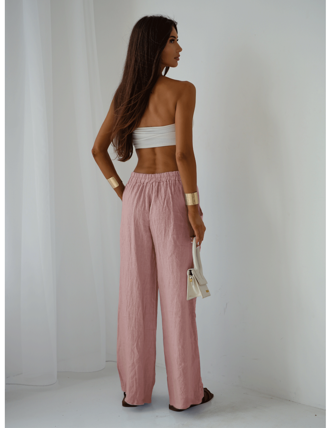 Stylowe lniane spodnie z szerokimi nogawkami ARIELLE - brudny róż