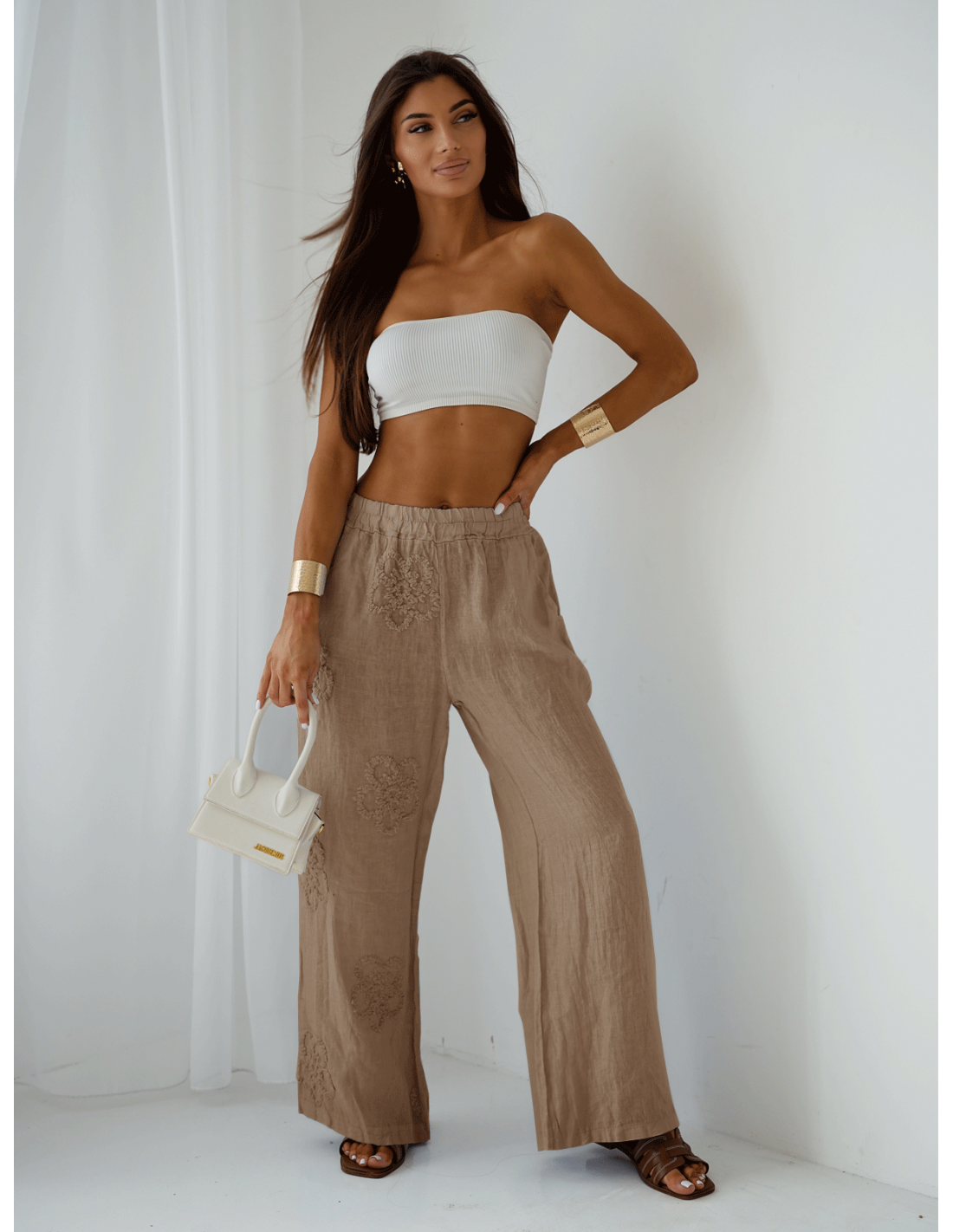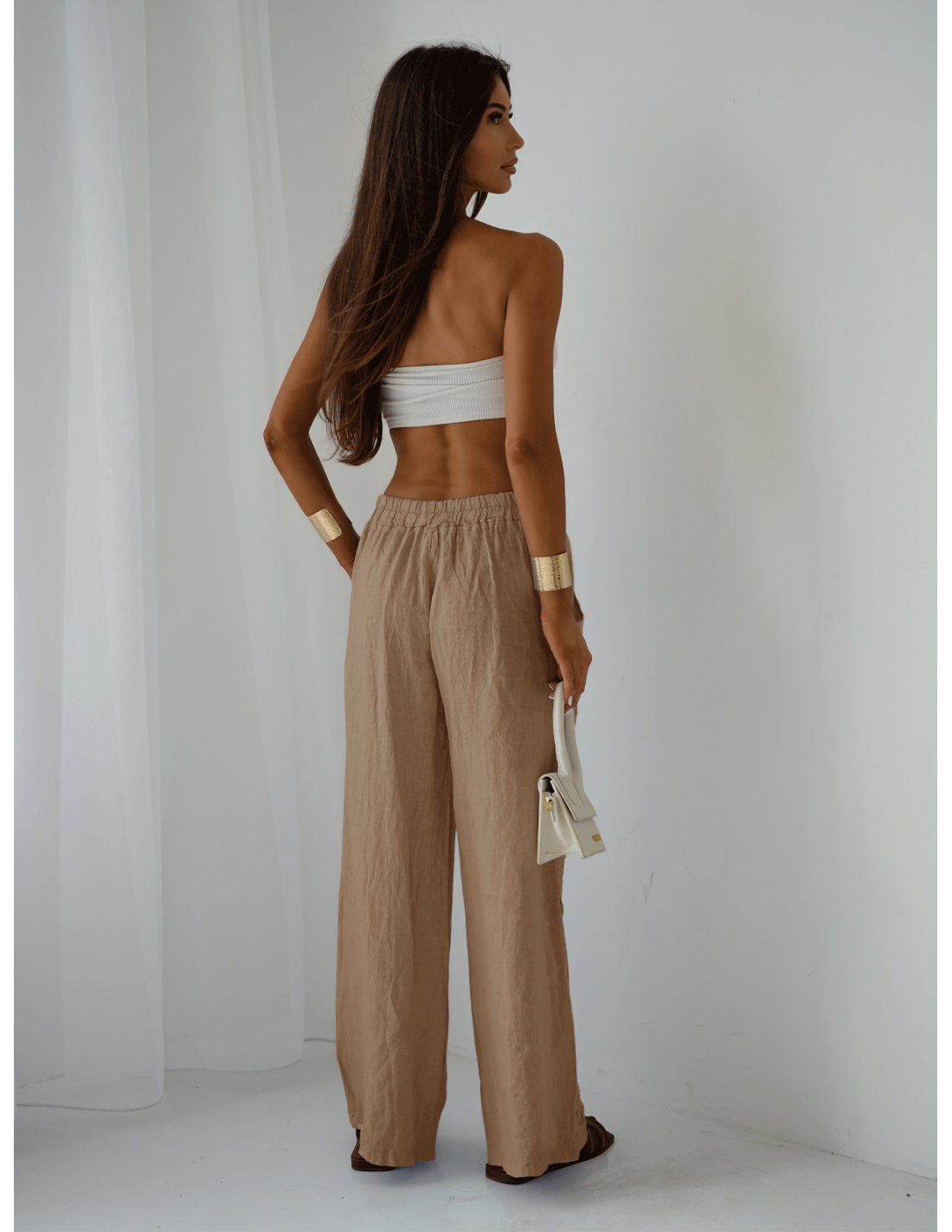 Stylowe lniane spodnie z szerokimi nogawkami ARIELLE - beżowe