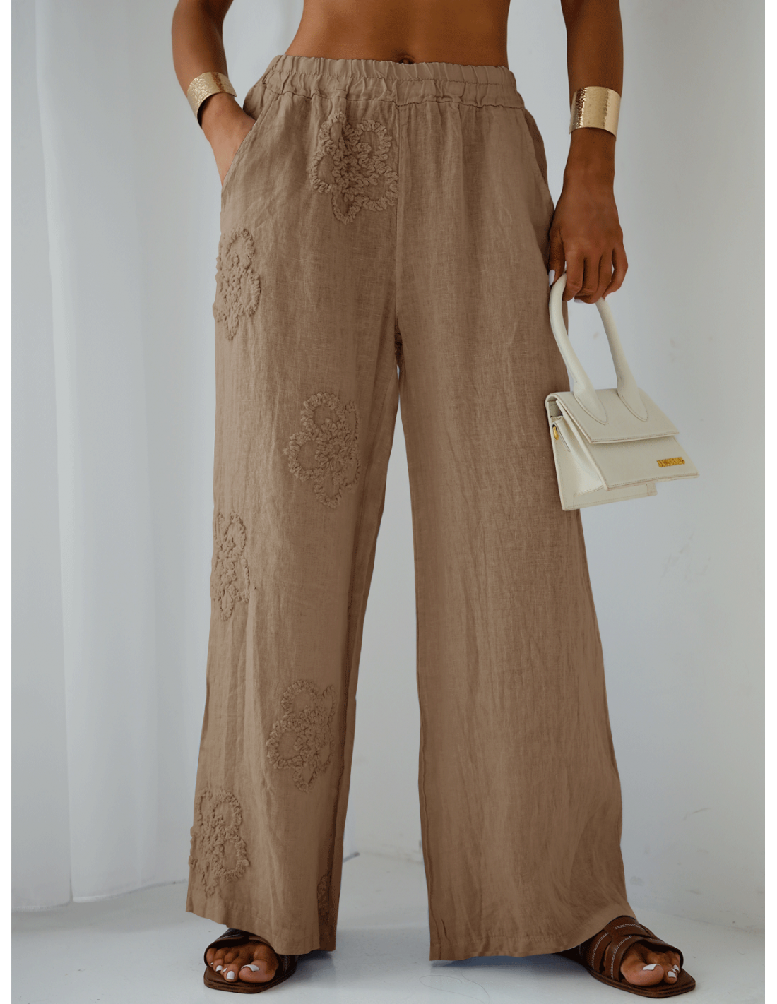 Poznaj letnią lekkość w najlepszym stylu – lniane spodnie z szerokimi nogawkami ARIELLE to kwintesencja wakacyjnego komfortu i kobiecej swobody.