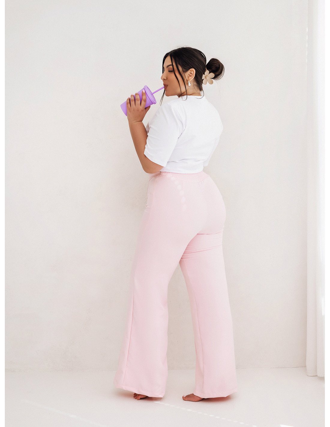 Eleganckie spodnie z szerokimi nogawkami w kolorze różowym dopasujesz do wielu stylizacji.