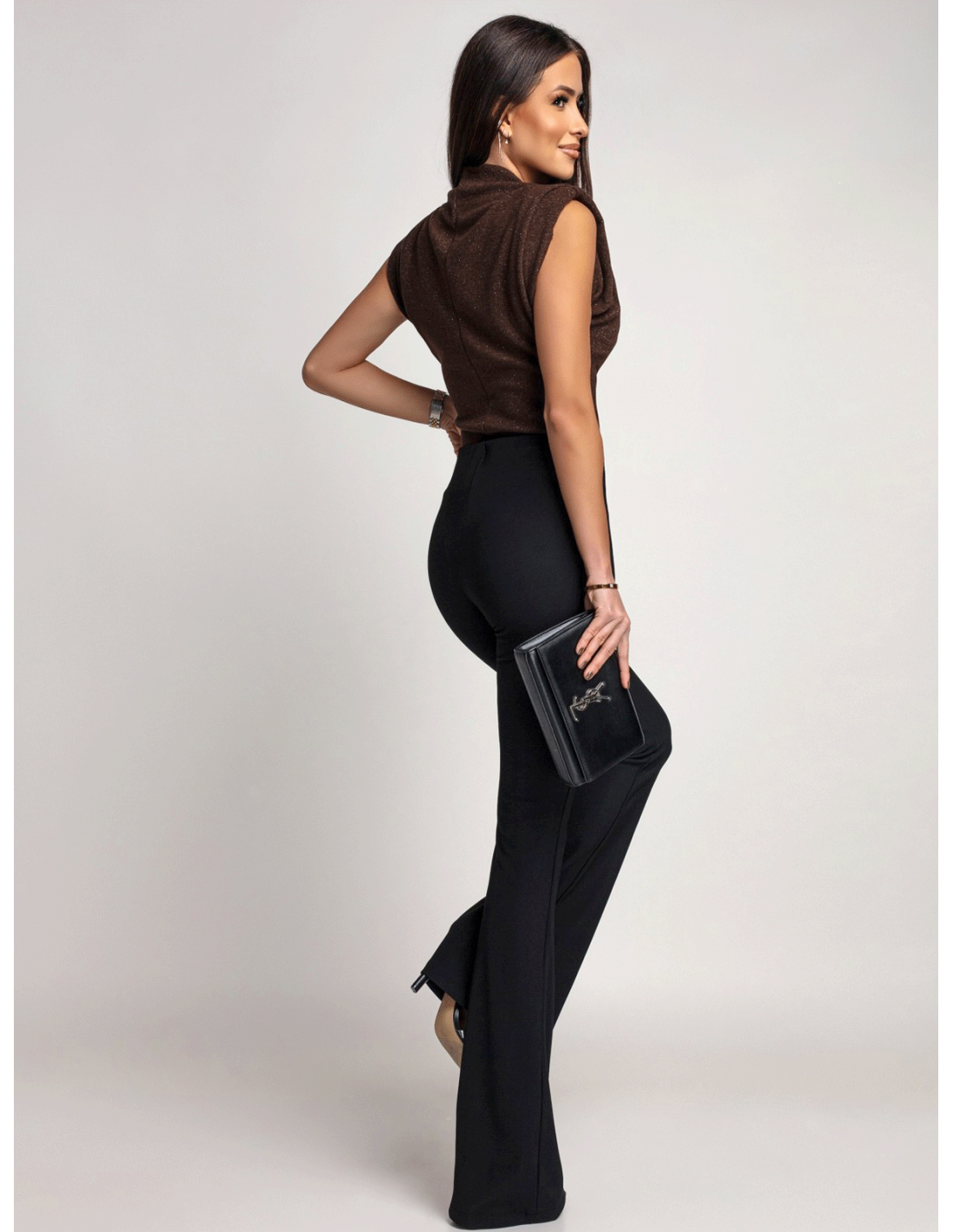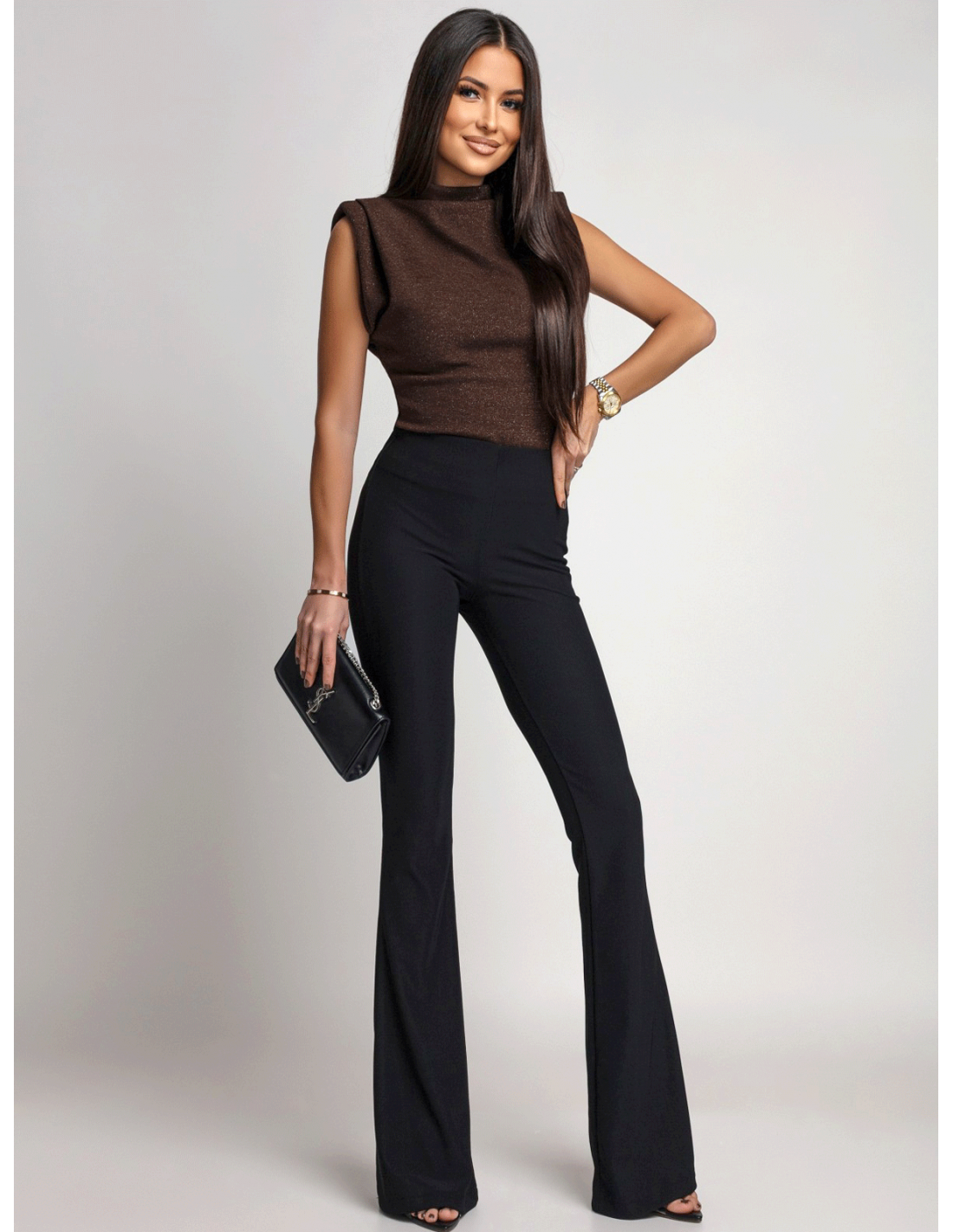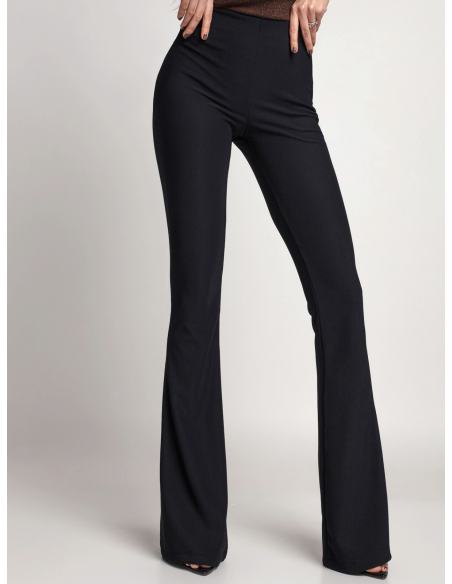 Rozszerzane nogawki typu dzwony optycznie wydłużają nogi i nadają całej stylizacji eleganckiej lekkości.