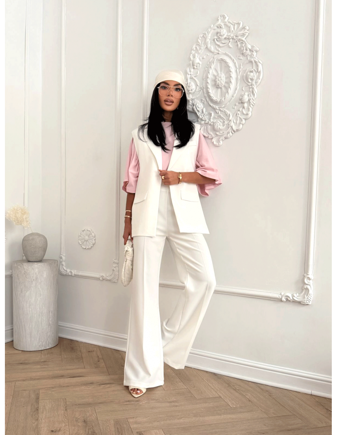 Białe spodnie zestaw z marynarką w tym samym kolorze i szpilkami dla eleganckiego total looku lub połącz z topem i sandałami, tworząc stylowy, nowoczesny outfit.