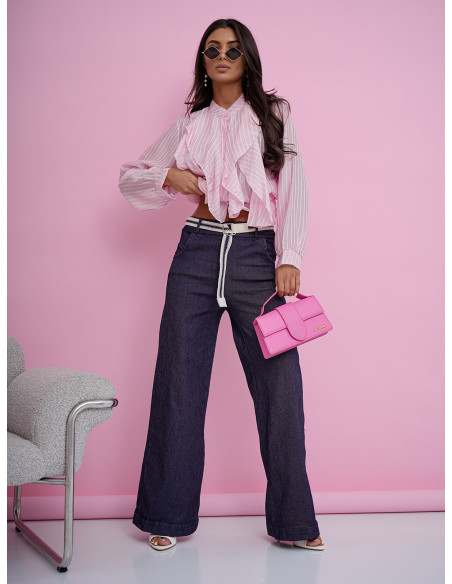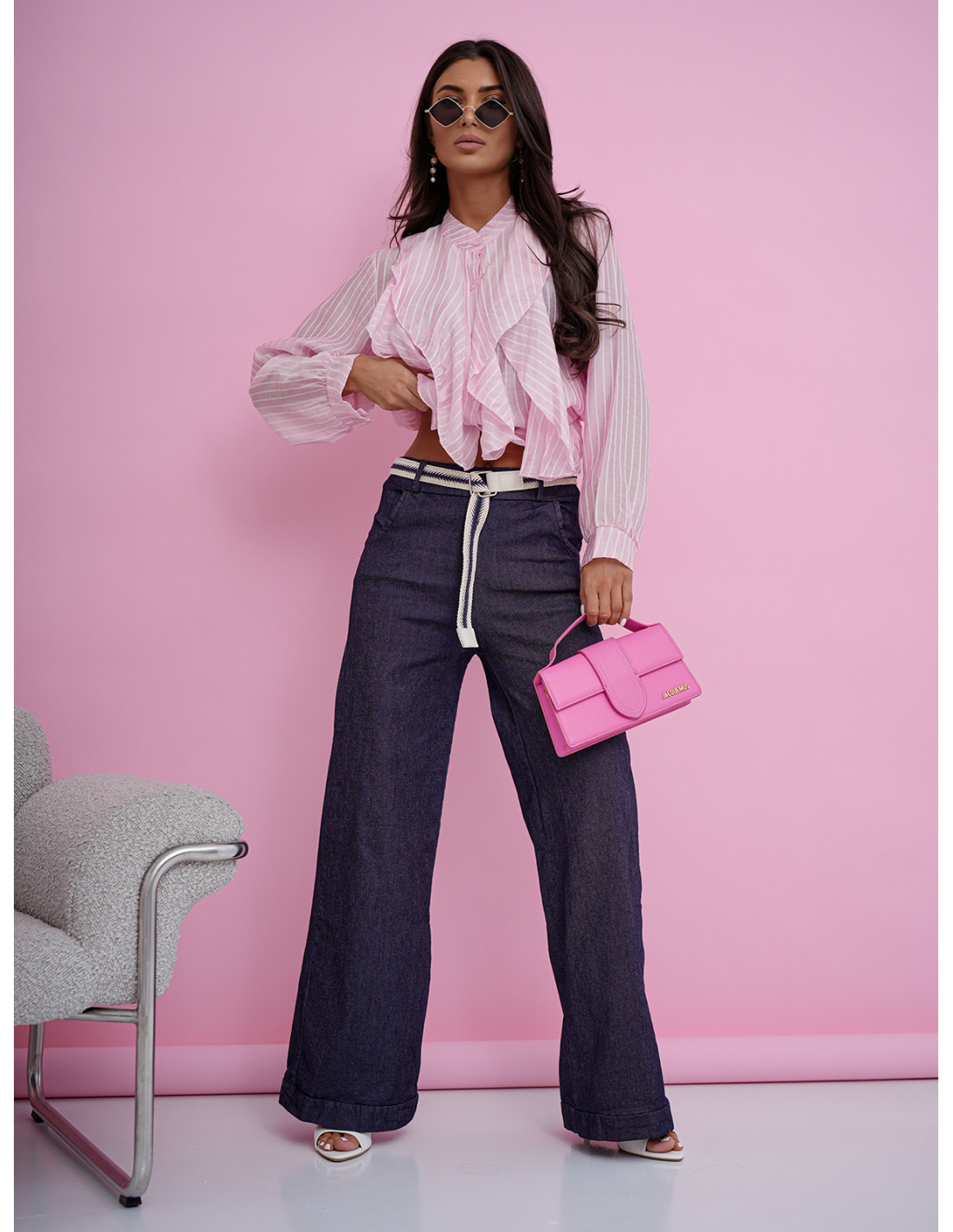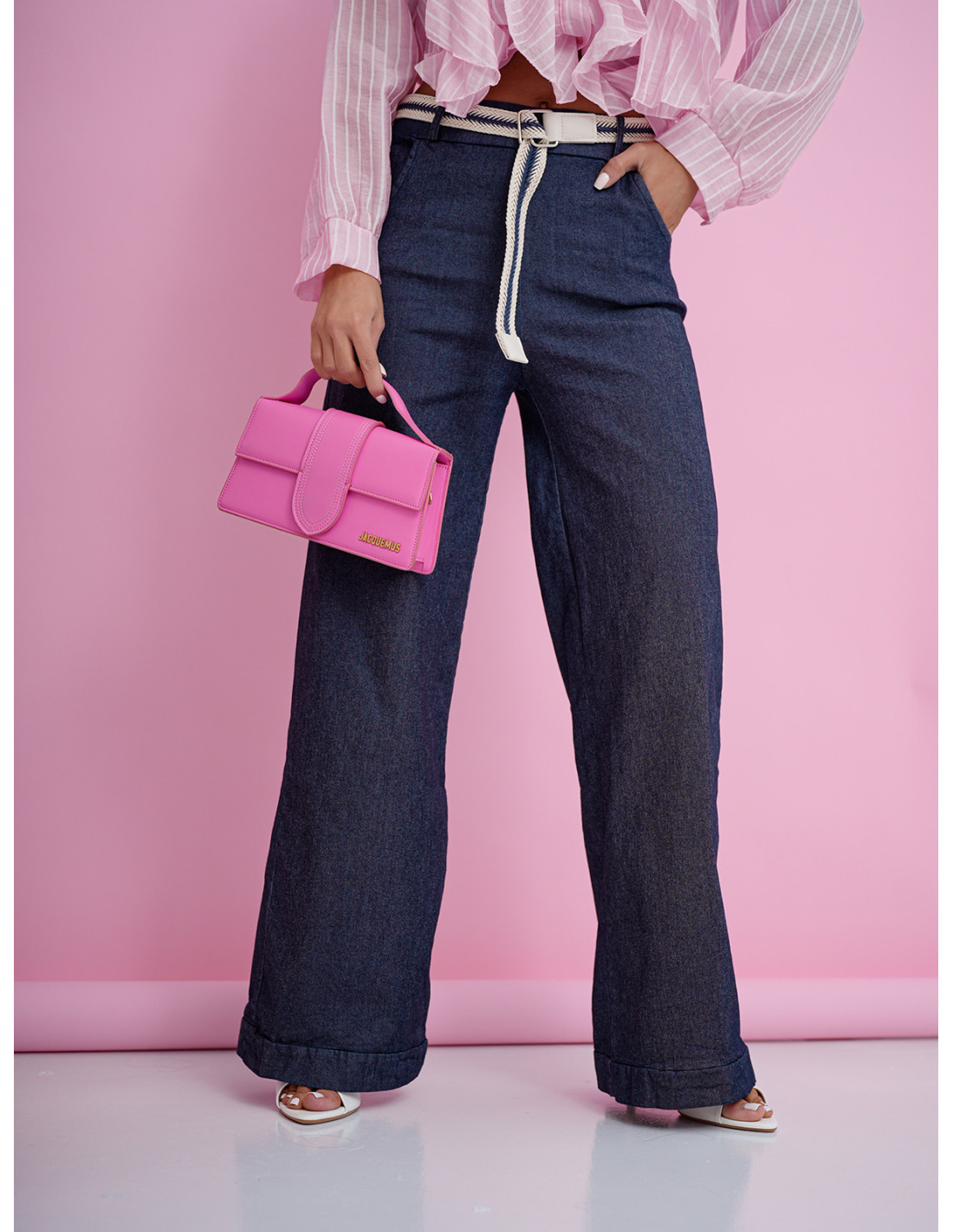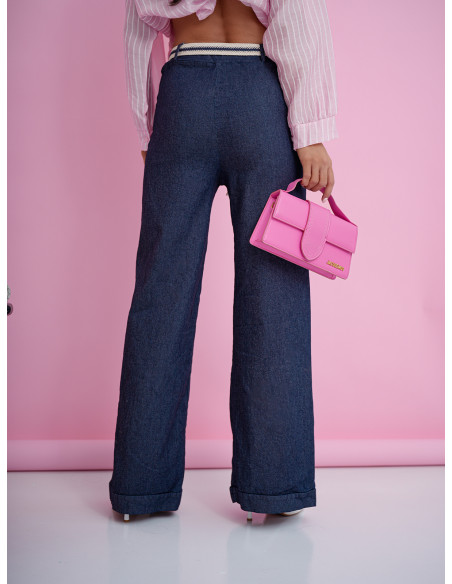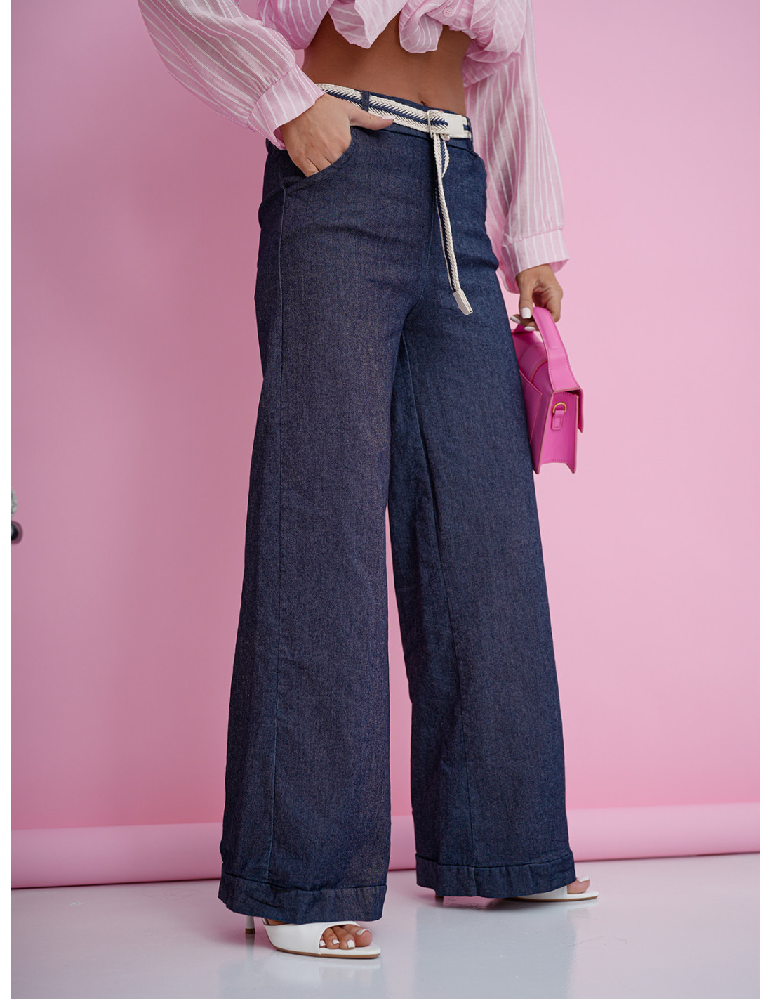 Fason z wysokim stanem i efektowną, szeroką nogawką pięknie wydłuża sylwetkę i nadaje jej lekkości.
