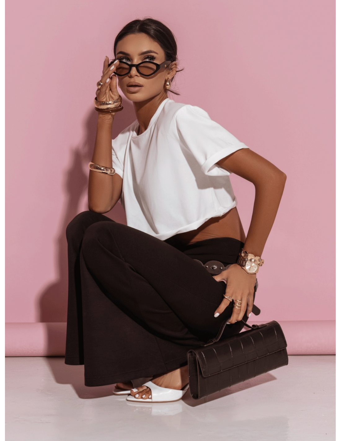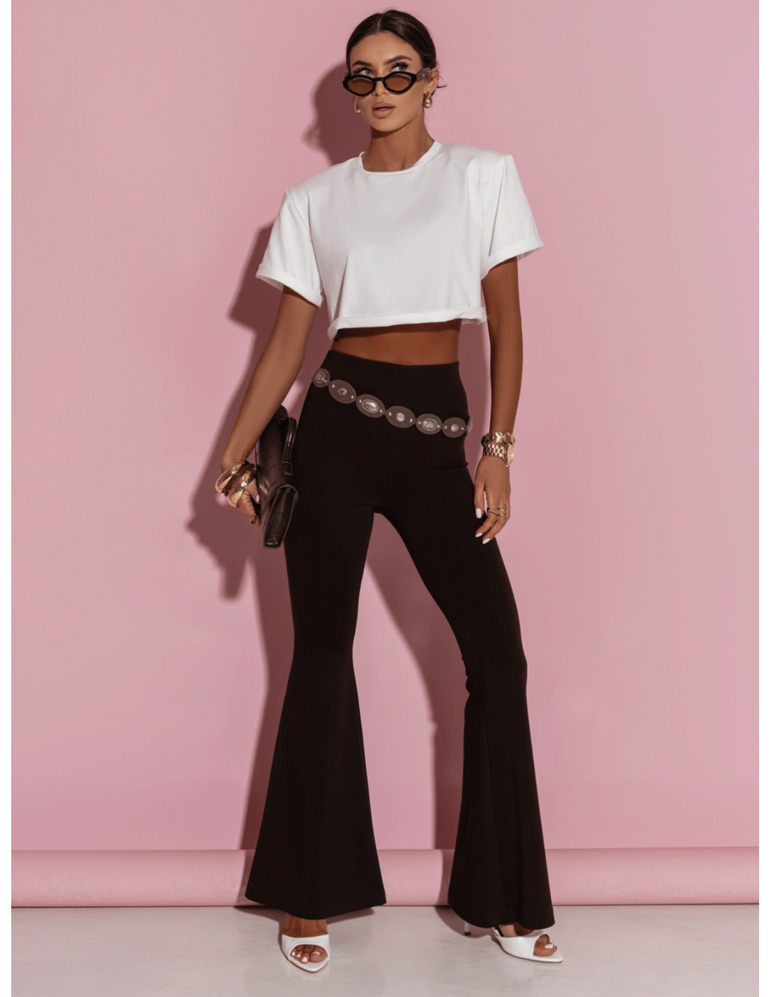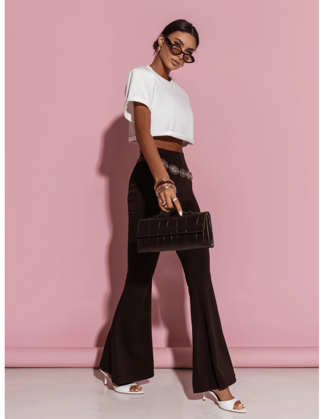 Noś z crop topem, sandałkami na obcasie i minimalistyczną biżuterią na wieczorne wyjście.