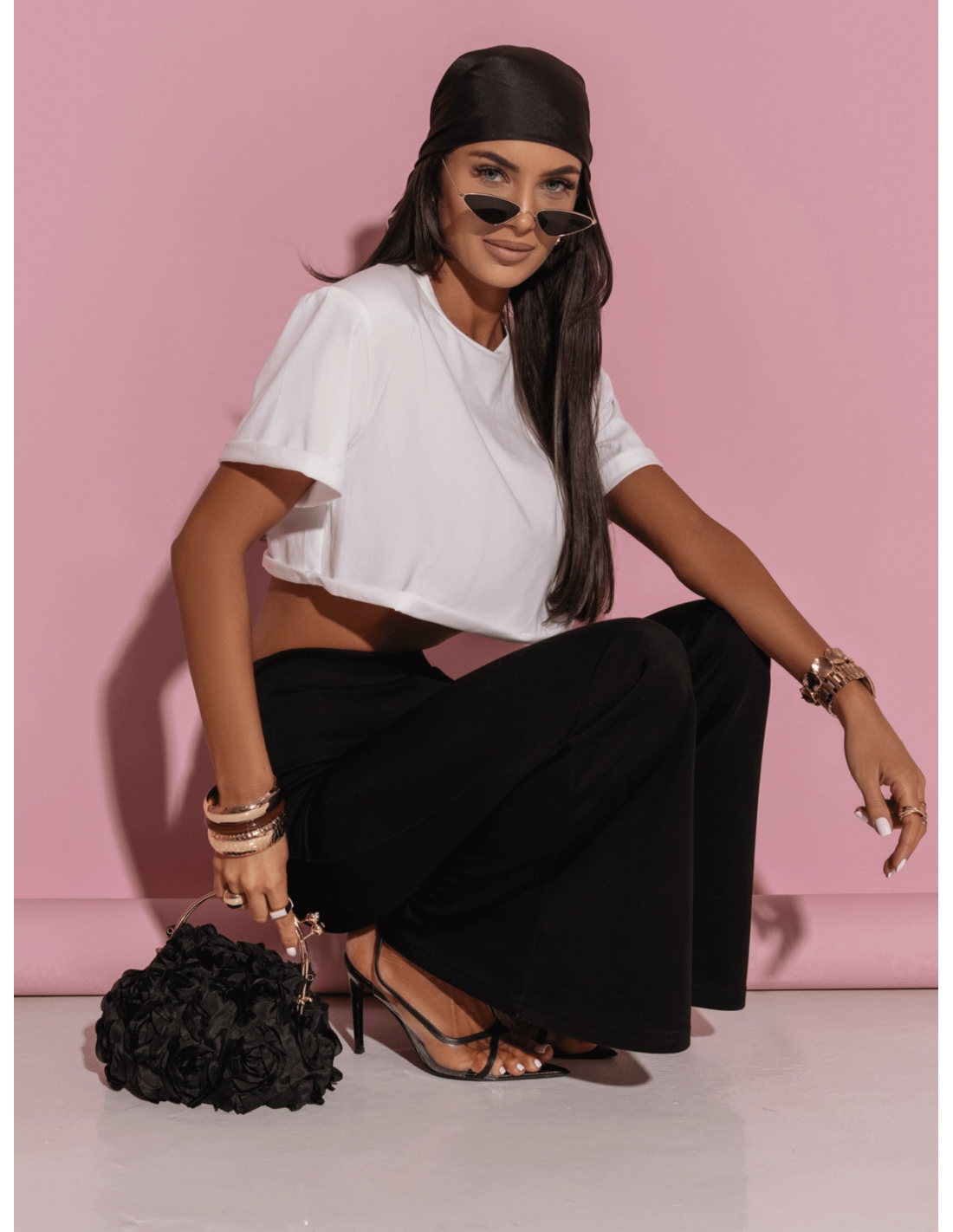Noś z crop topem, sandałkami na obcasie i minimalistyczną biżuterią na wieczorne wyjście.