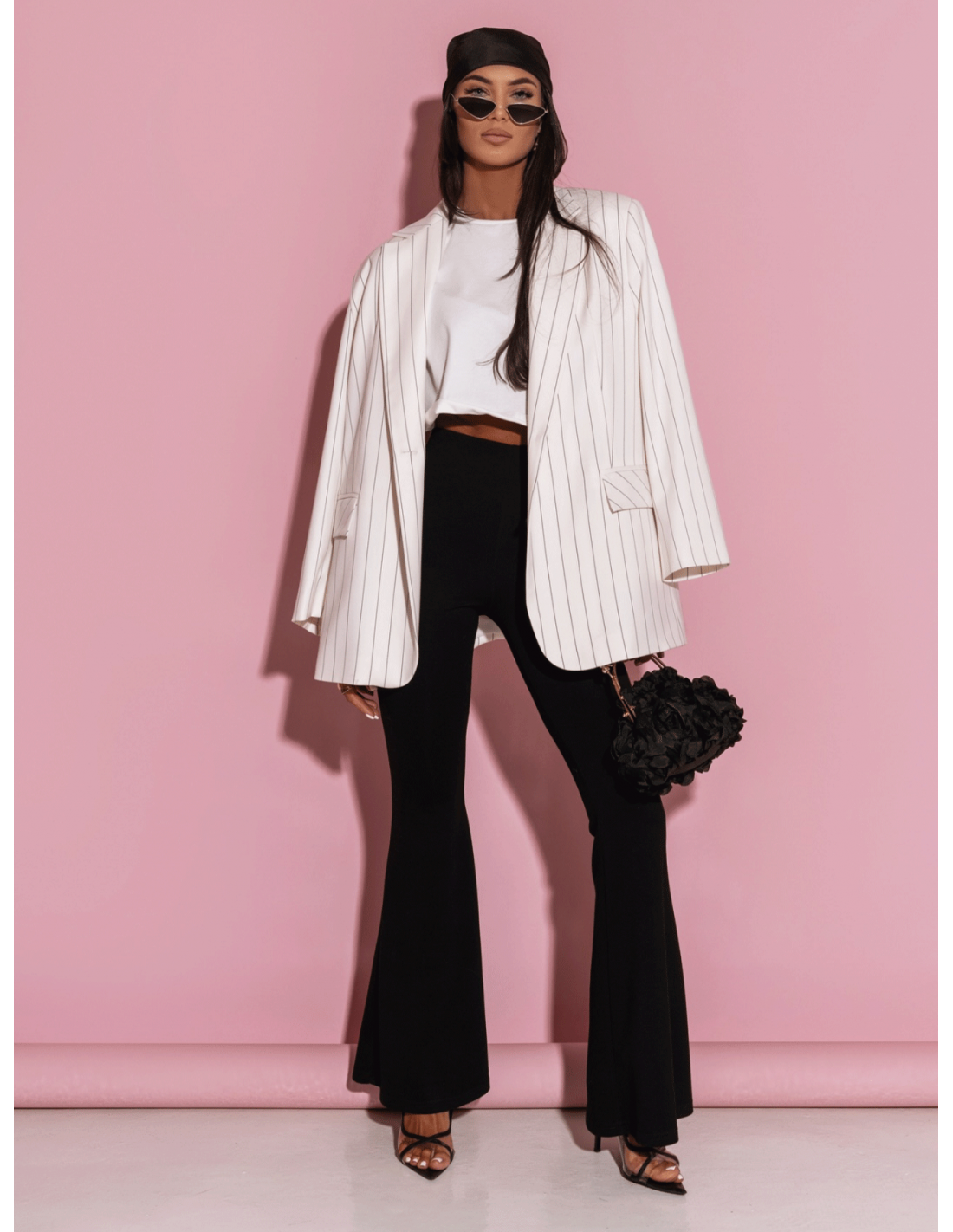 Model jest dopasowany w górnej części, dzięki czemu podkreśla talię i biodra, a efektowne nogawki typu dzwony nadają stylizacji niezwykle kobiecego charakteru oraz optycznie wydłużają nogi.
