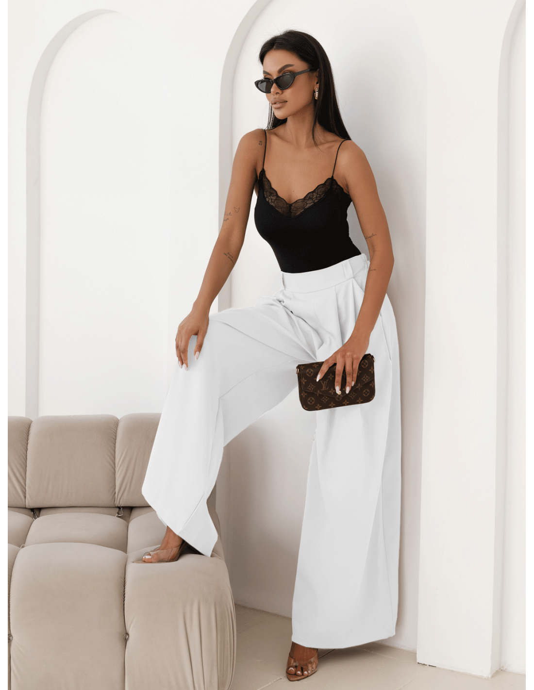 Szerokie nogawki pięknie układają się w ruchu, optycznie wydłużając sylwetkę i dodając jej lekkości.
