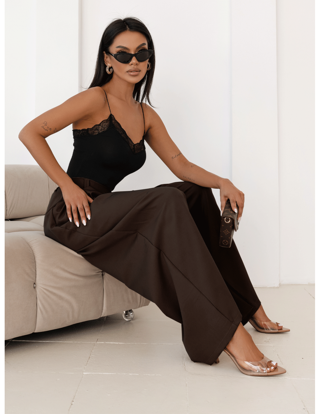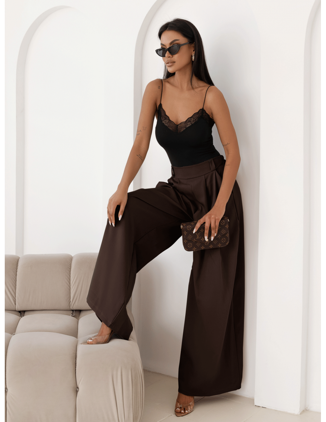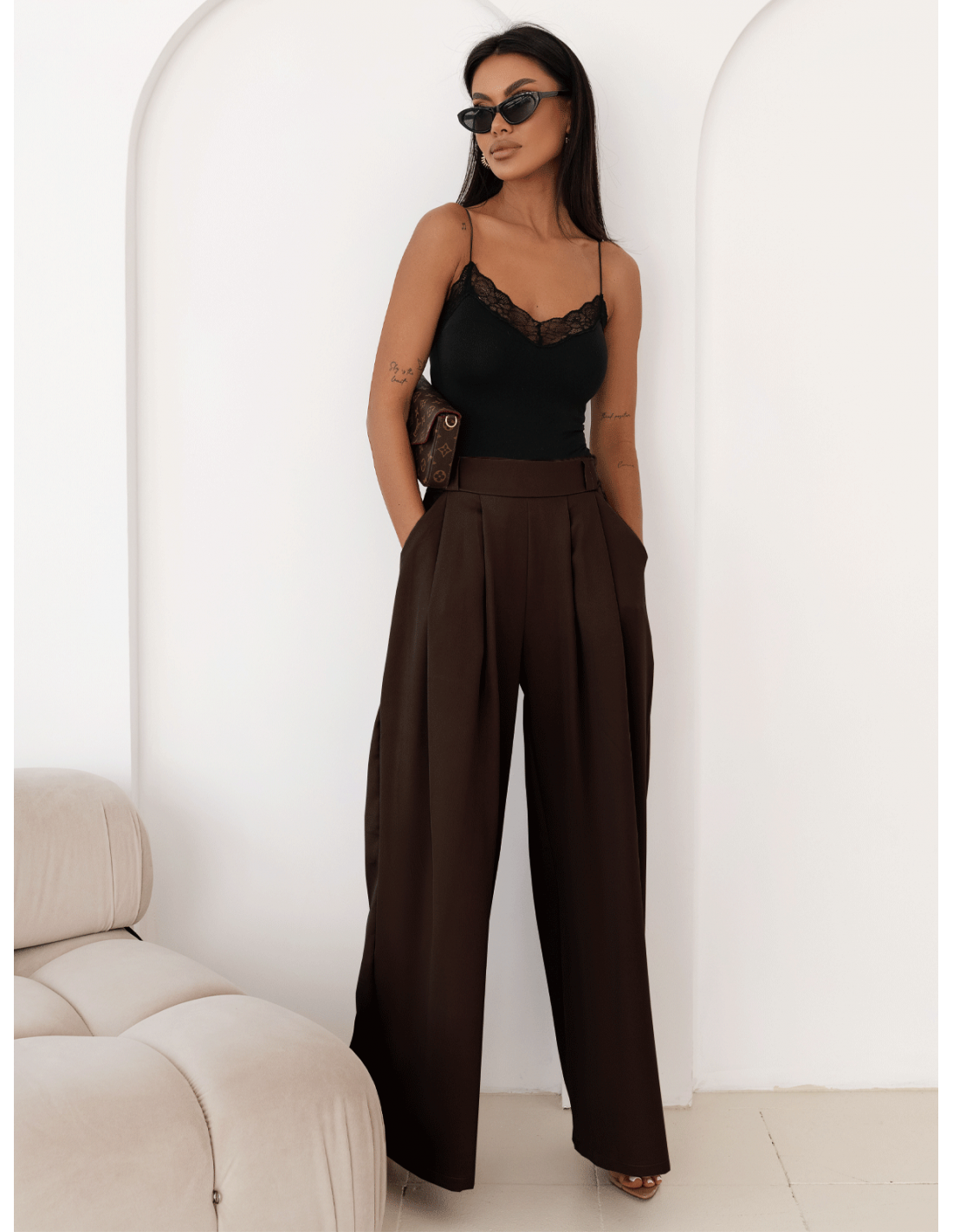 Stylowe szerokie spodnie w kolorze czekoladowym nadadzą stylizacji luksusowego charakteru.