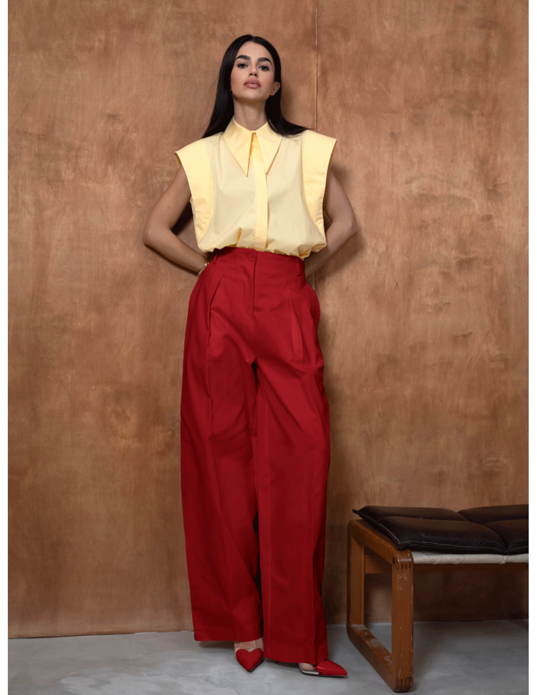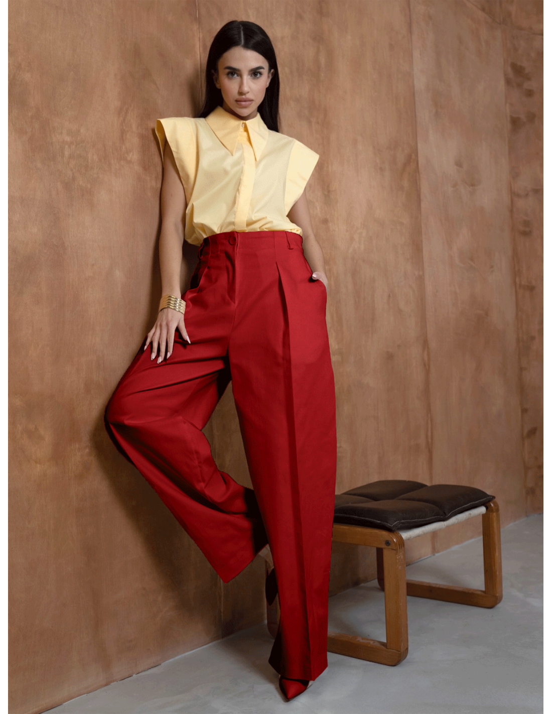 Na co dzień zestaw czerwone spodnie z prostym topem i mokasynami lub sneakersami, tworząc stylowy, miejski outfit z nutą elegancji.