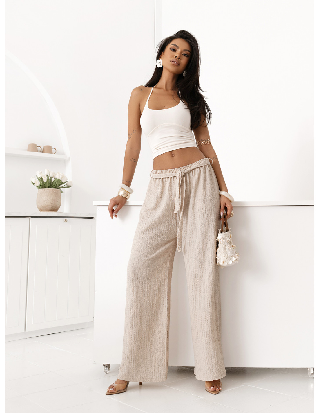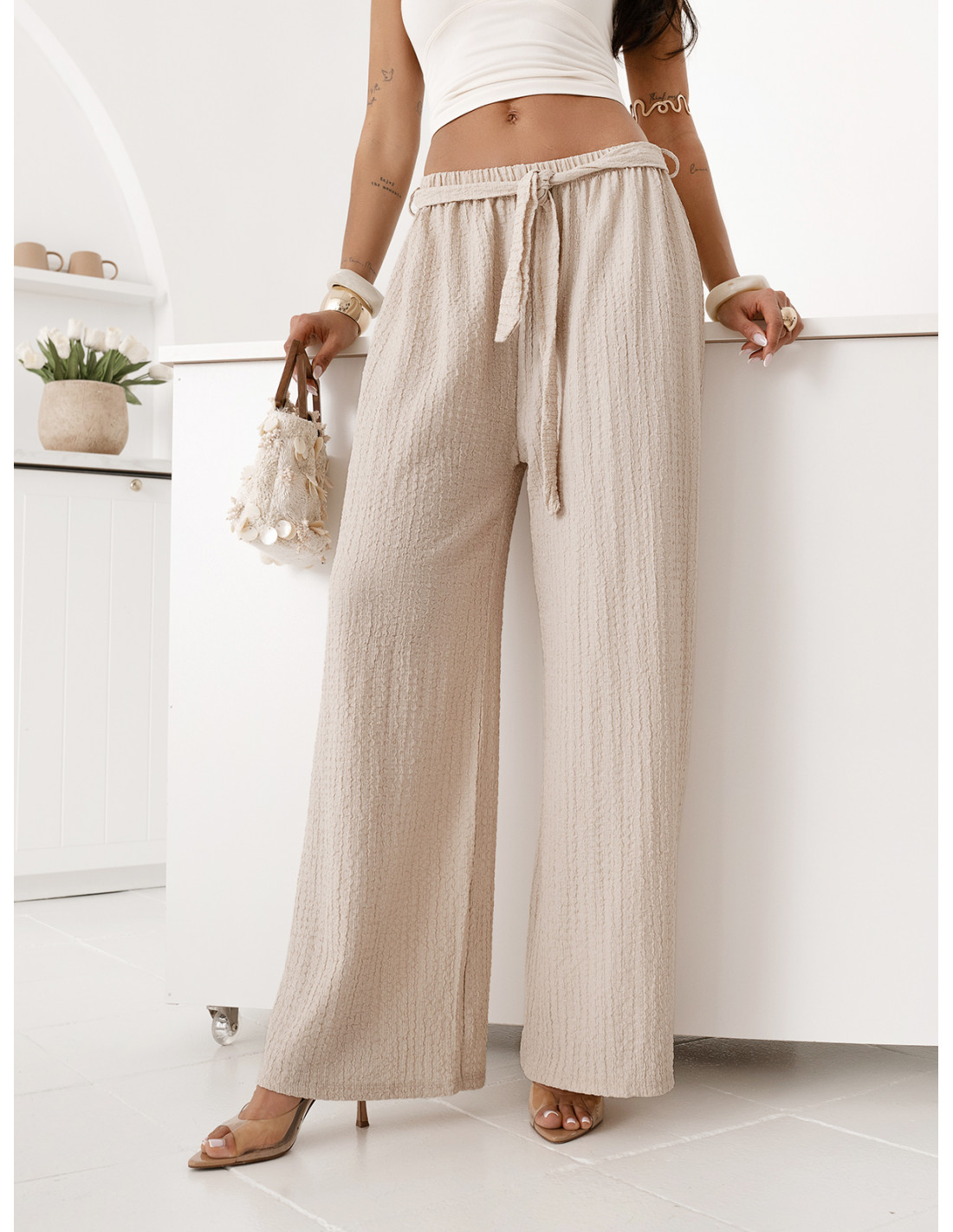 Szerokie spodnie z wiązaniem BREZELLA - beżowe