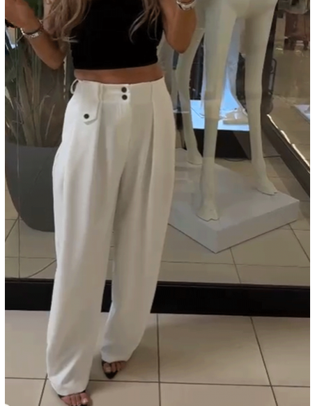 Szerokie nogawki, delikatnie zwężane ku dołowi, nadają całości lekkości i modowego charakteru.