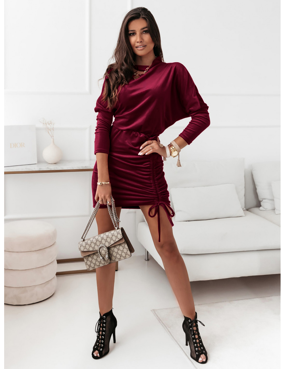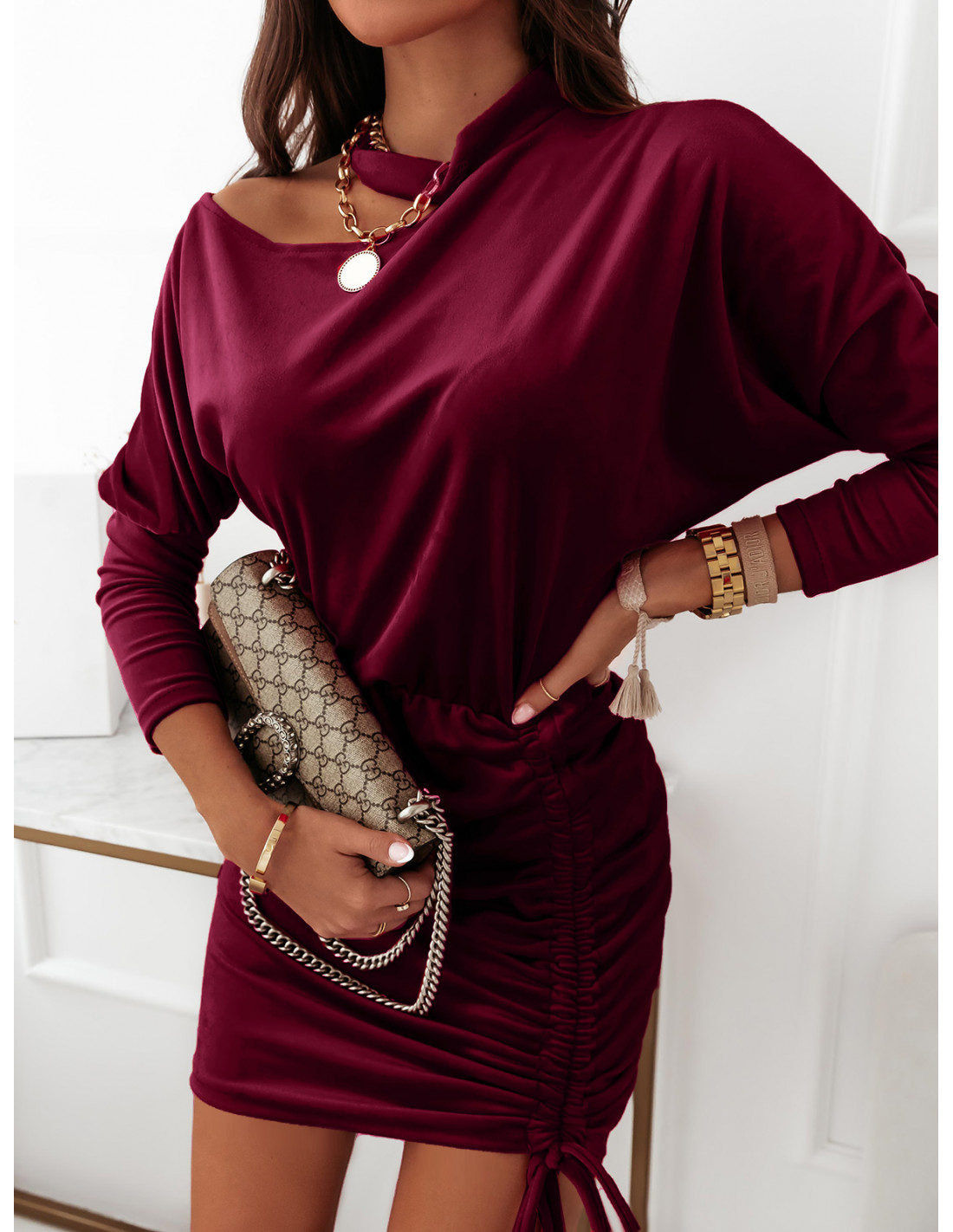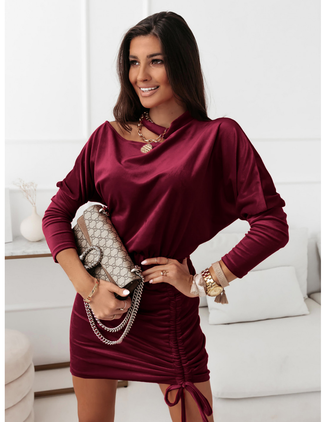 Welurowa sukienka z chokerem - MIRANDA - bordowa