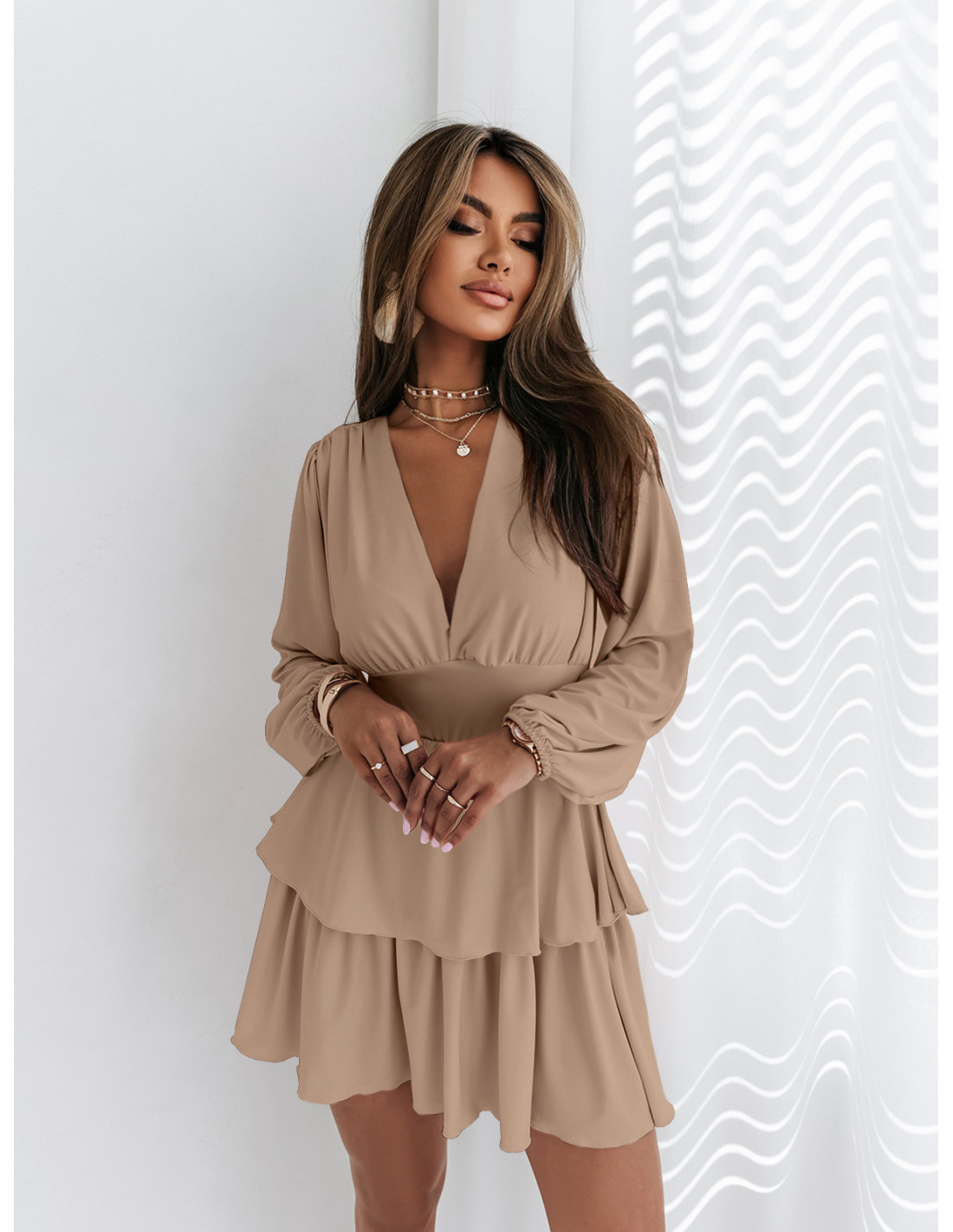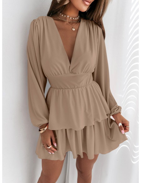 Rozkloszowana sukienka z głębokim dekoltem ELISJA - beżowa