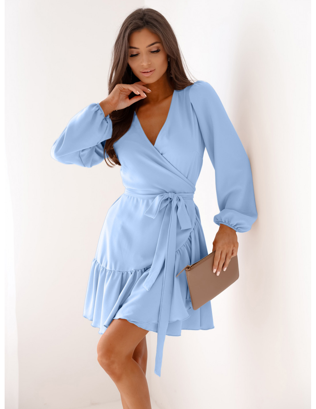 Przekładana sukienka w kolorze błękitnym to elegancka i kobieca kreacja.