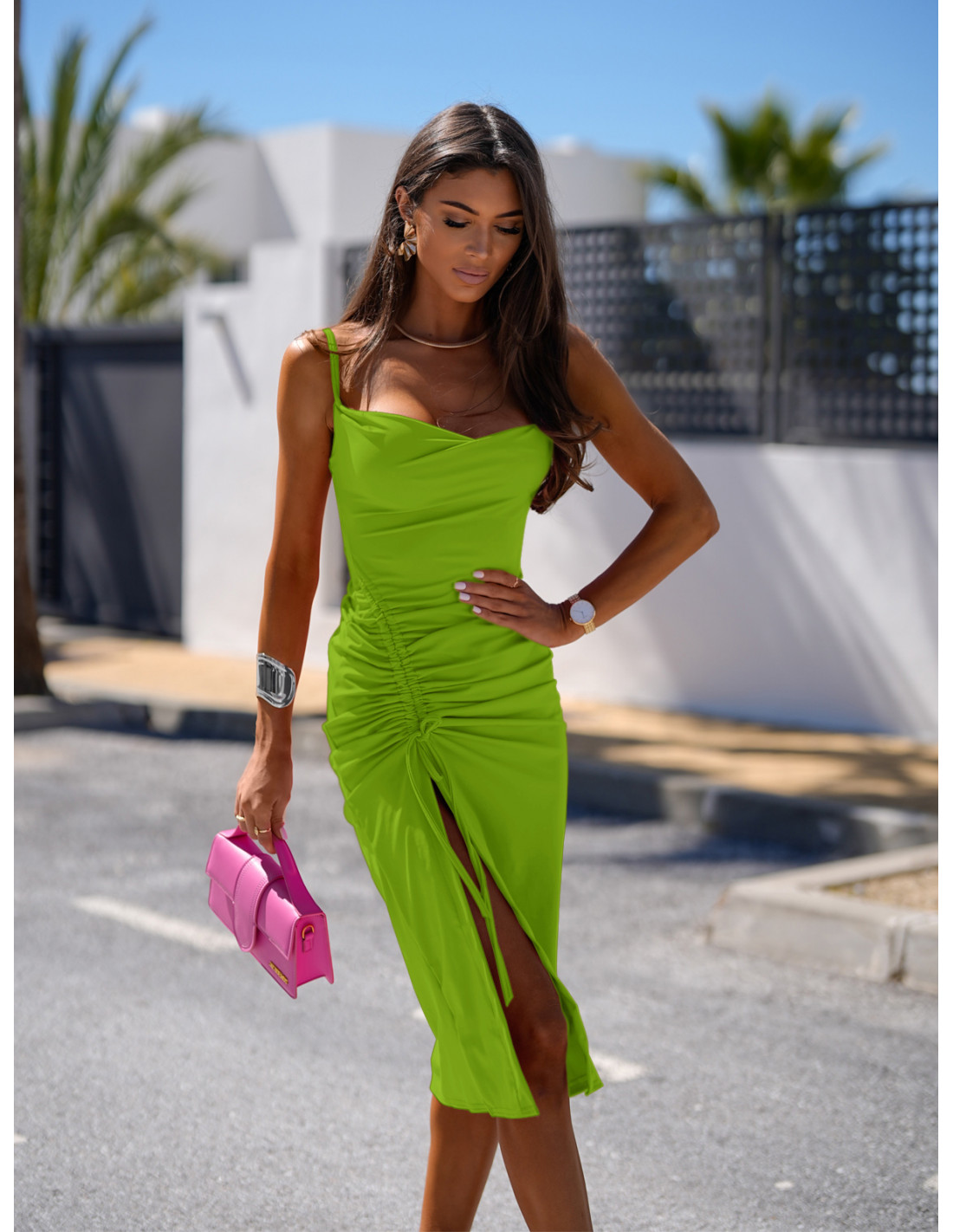 Dopasowana sukienka z marszczeniem w kolorze limonkowym skutecznie podkręci każdy outfit.