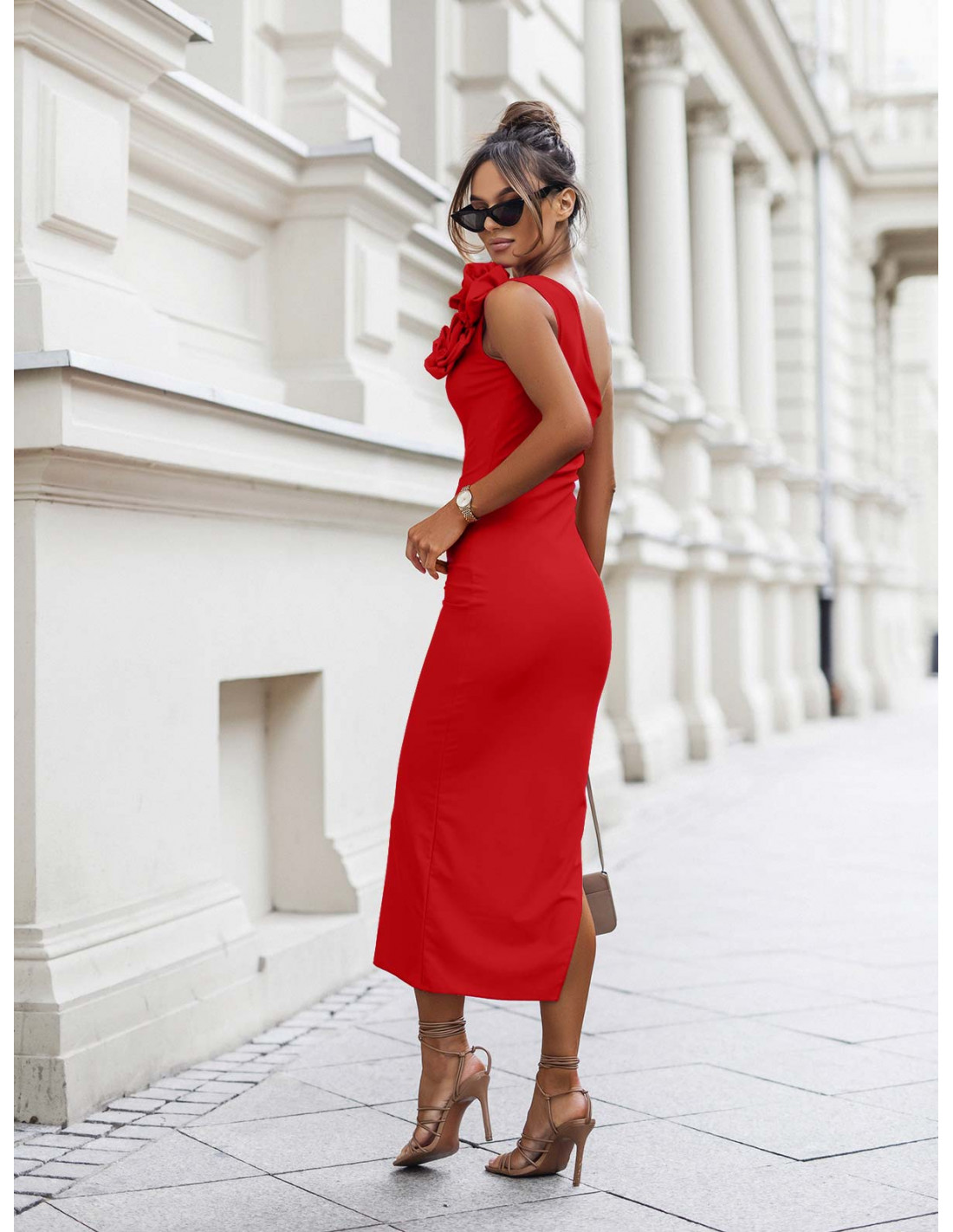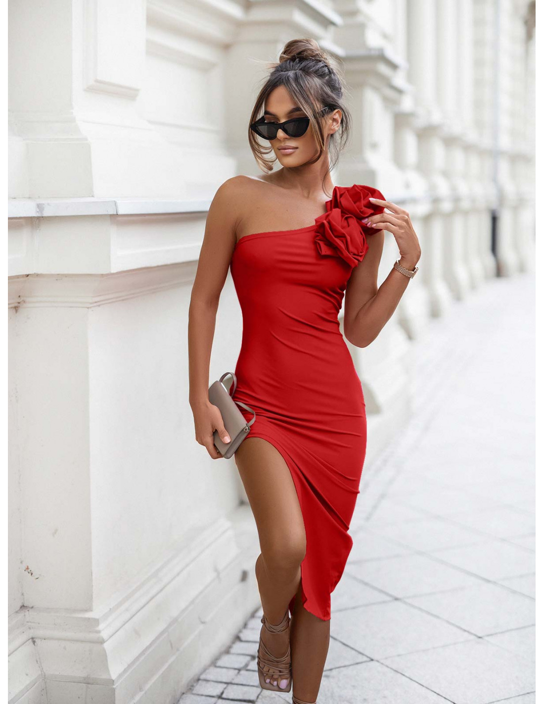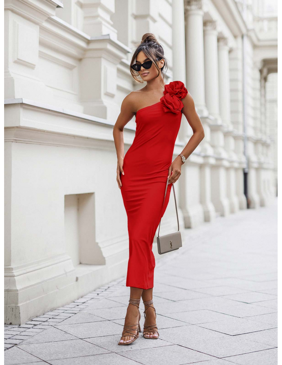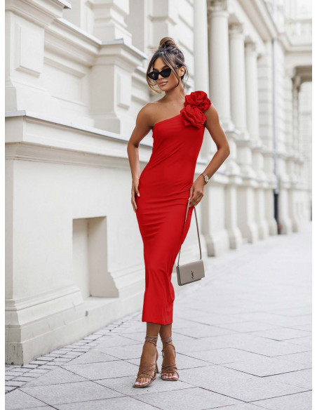 Sukienka midi na jedno ramię z różami JESS - czerwona