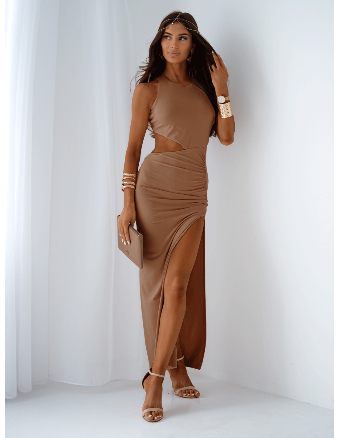 Dopasowana sukienka maxi z odkrytymi plecami BLANCA - cappuccino