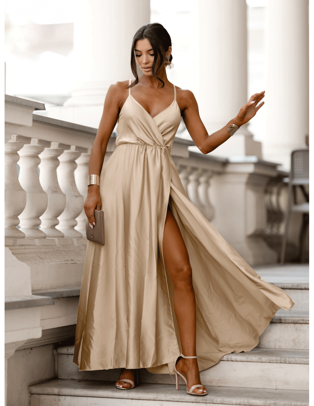 Zjawiskowa, kobieca i z nutą zmysłowości – ta sukienka maxi w kolorze szampańskim to idealna propozycja na wielkie wyjścia.