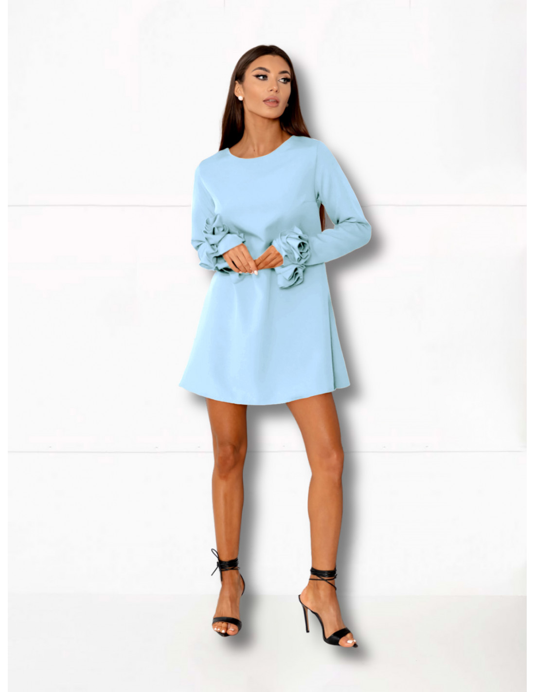 Ta stylowa mini sukienka z długimi rękawami zakończonymi ozdobnymi kwiatami, doskonale podkreśli Twoją figurę, zapewniając wygodę i swobodę ruchów.
