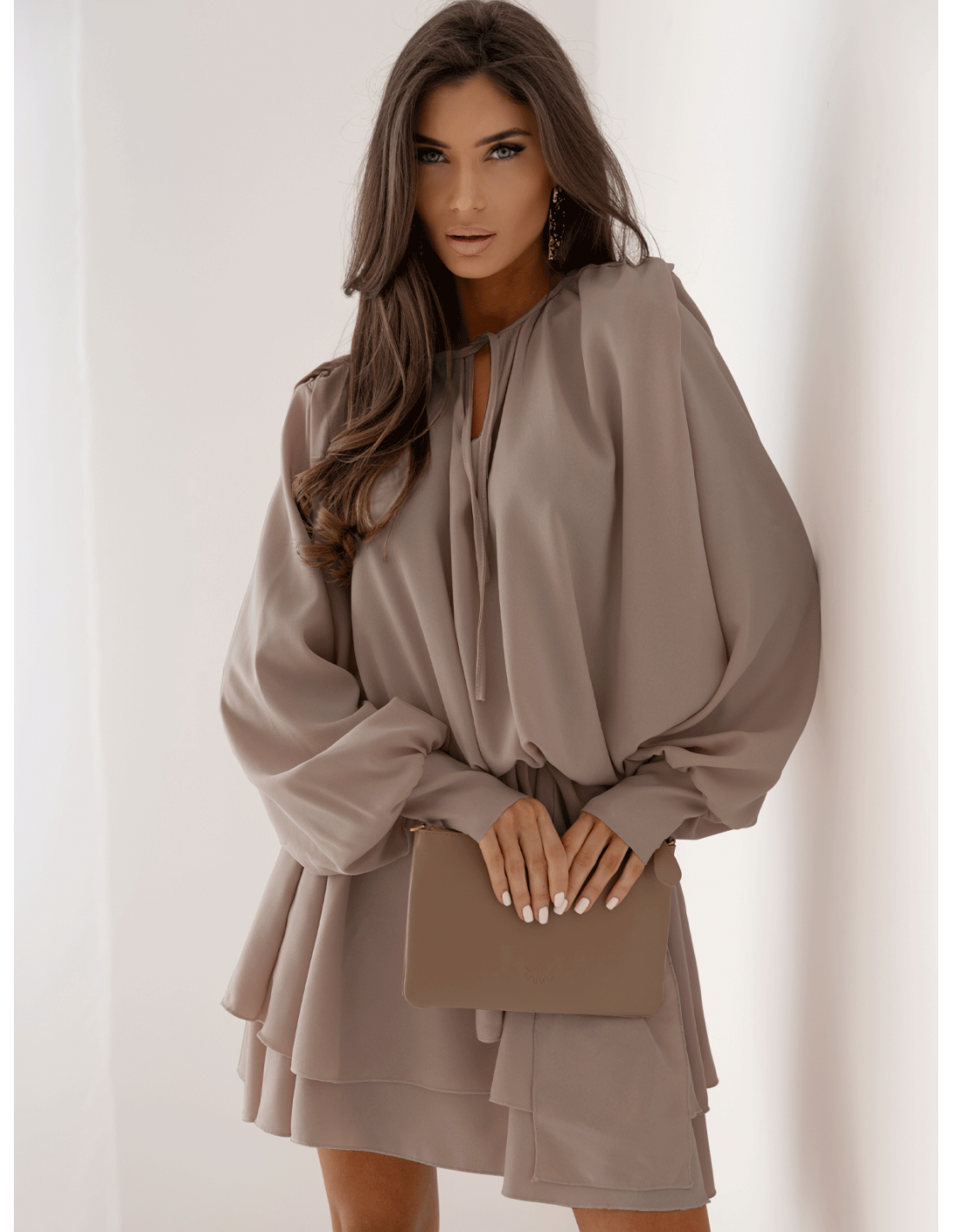 Rozkloszowana sukienka mini w kolorze mocha mousse koniecznie musi zagościć w Twojej garderobie.
