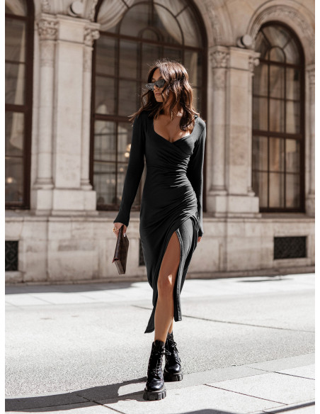Efektowne drapowanie w talii optycznie wysmukla, a wysokie rozcięcie na nodze dodaje całości pazura i zmysłowości.