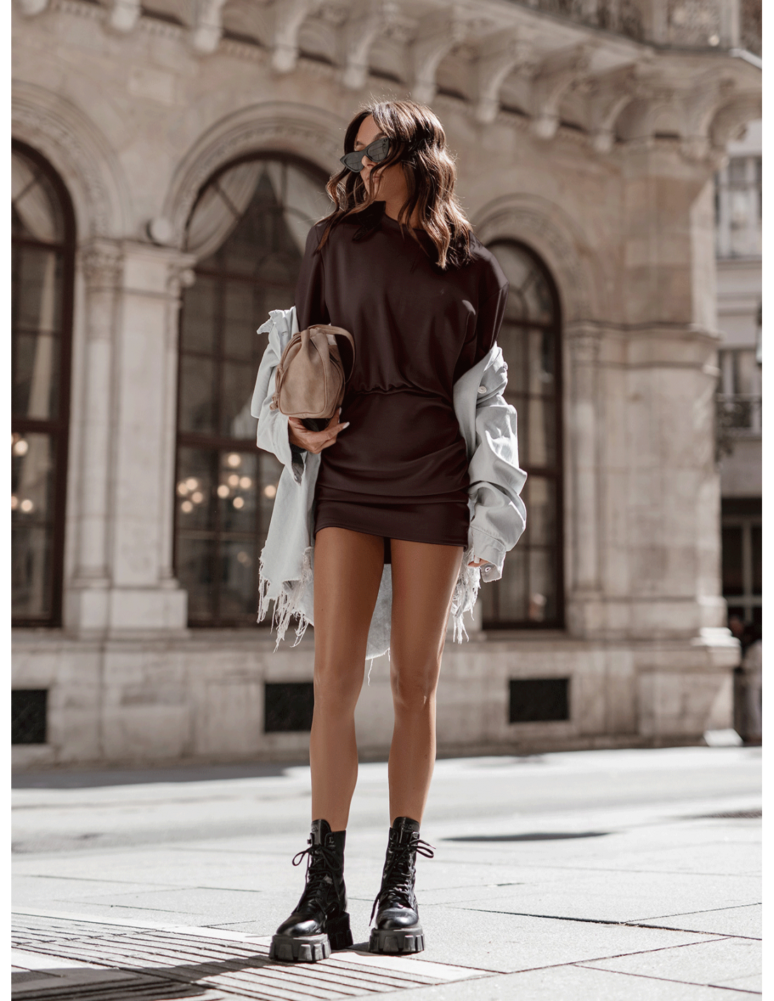 Czekoladowy kolor sprawia, że sukienka łatwo wpisuje się w każdą kapsułową garderobę.