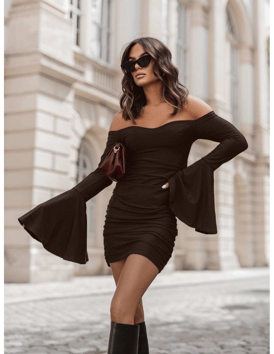 Sukienka mini z odkrytymi ramionami ELAMIA - czekoladowa