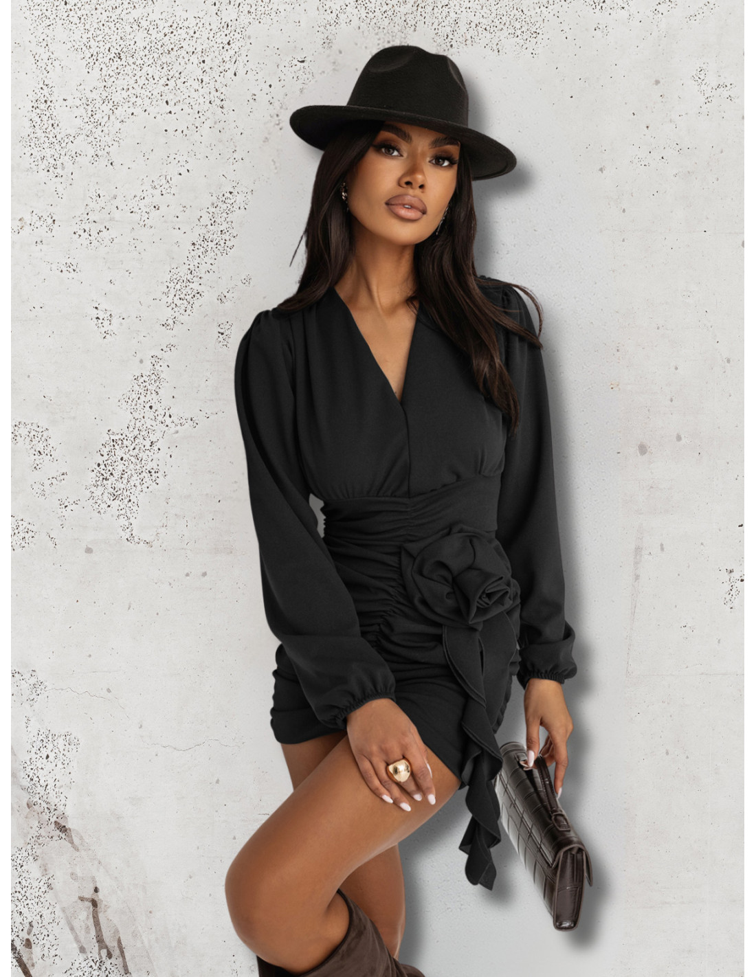 Marszczona sukienka z ozdobnym kwiatem HASJA - czarna