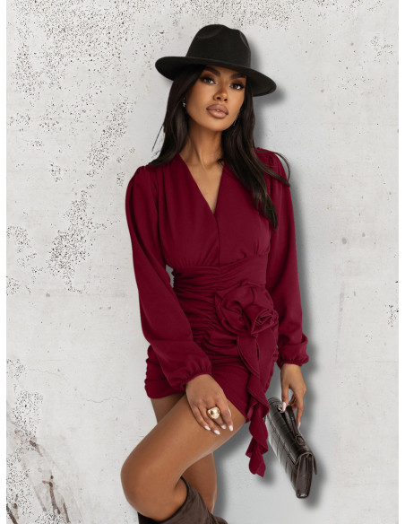 Marszczona sukienka z ozdobnym kwiatem HASJA - bordowa