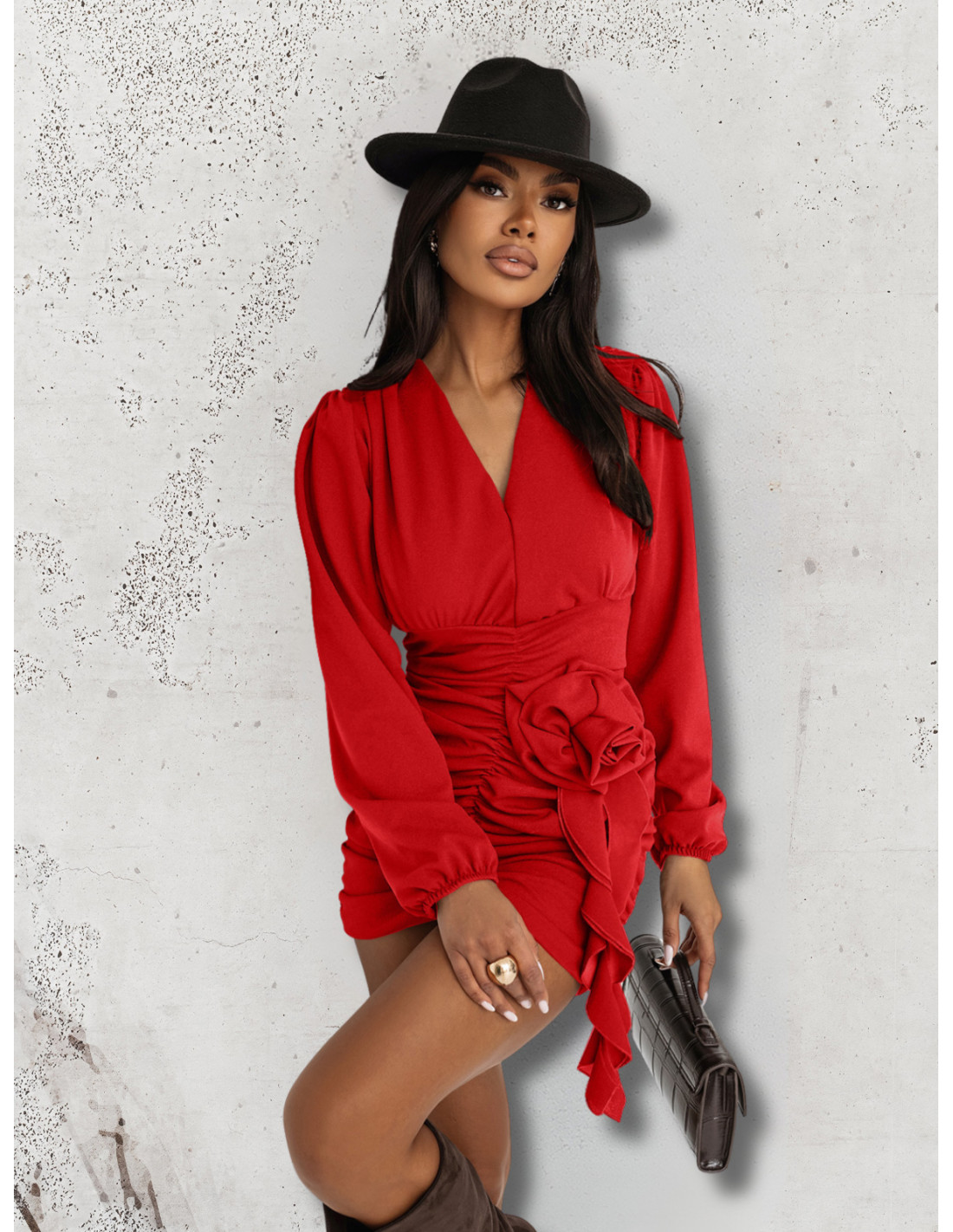 Marszczona sukienka z ozdobnym kwiatem HASJA - czerwona