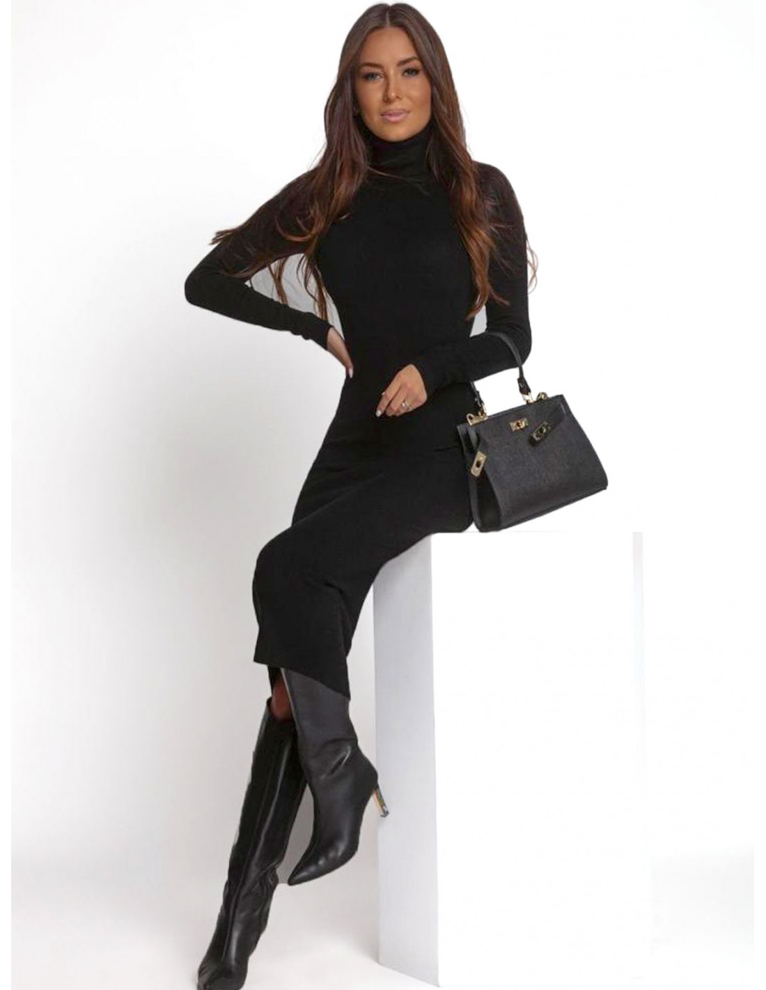 Jej dopasowany krój midi pięknie podkreśla sylwetkę, a golf dodaje elegancji i ciepła w chłodniejsze dni.