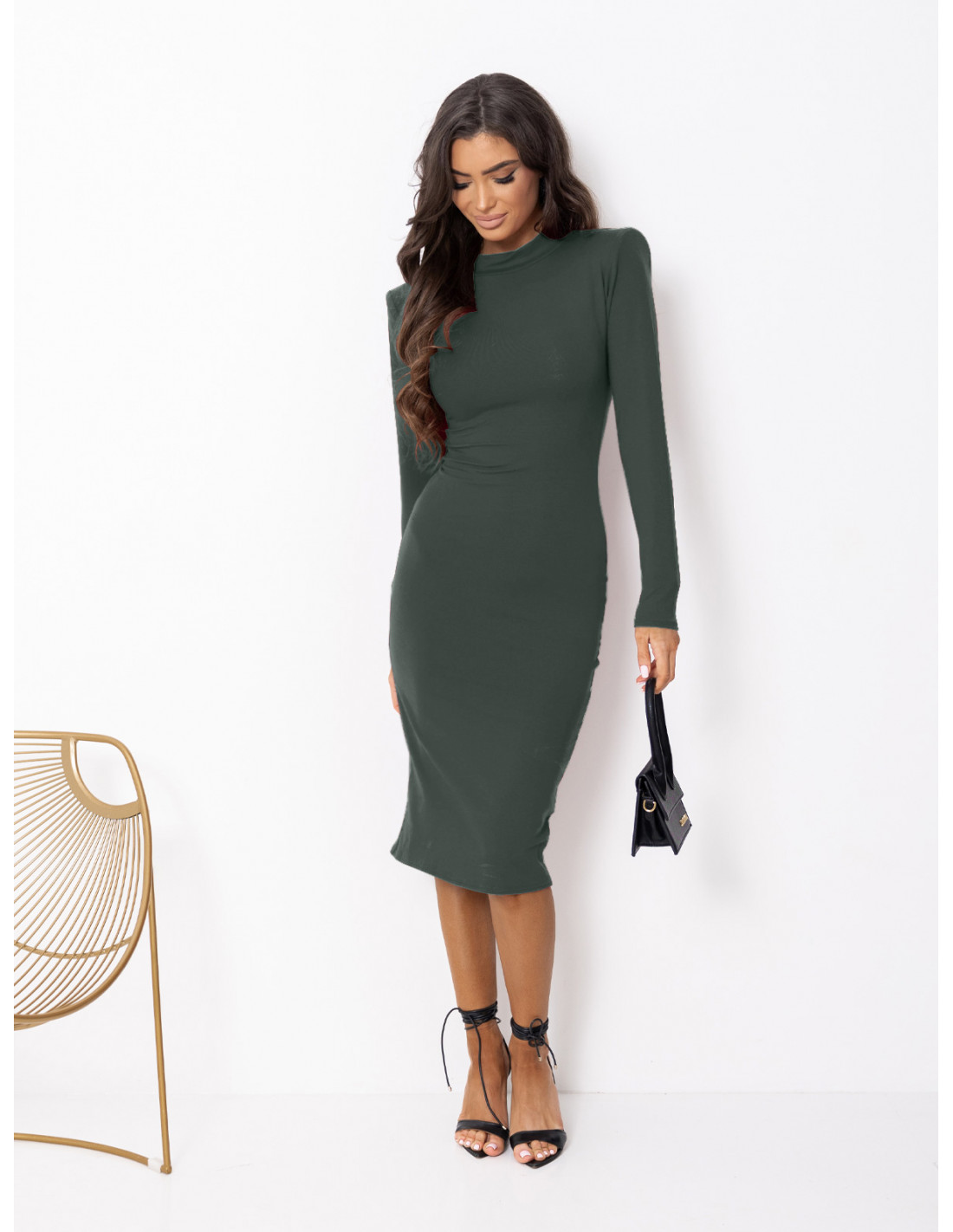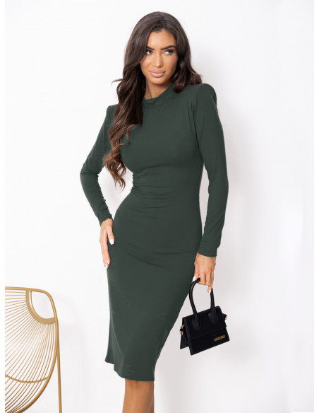 Ta dopasowana sukienka midi z półgolfem to kwintesencja elegancji i minimalizmu, idealna dla kobiet ceniących klasykę i komfort.