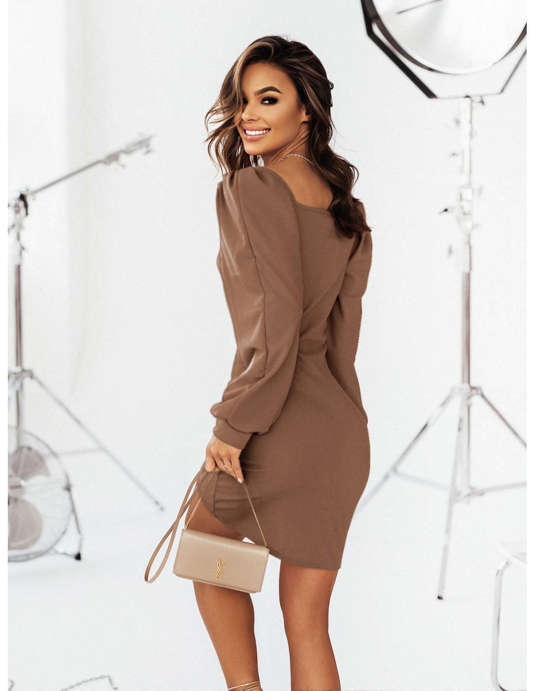 Sukienka z bufiastymi rękawami ADIANA - mocha mousse