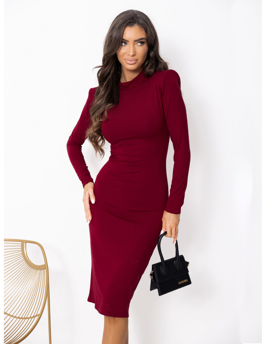 Ta dopasowana sukienka midi z półgolfem to kwintesencja elegancji i minimalizmu, idealna dla kobiet ceniących klasykę i komfort.