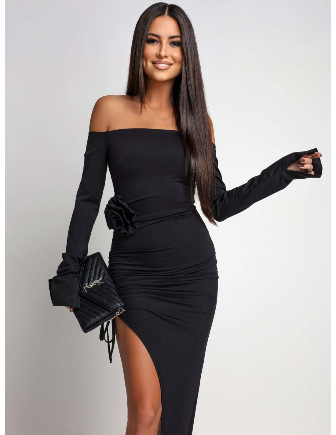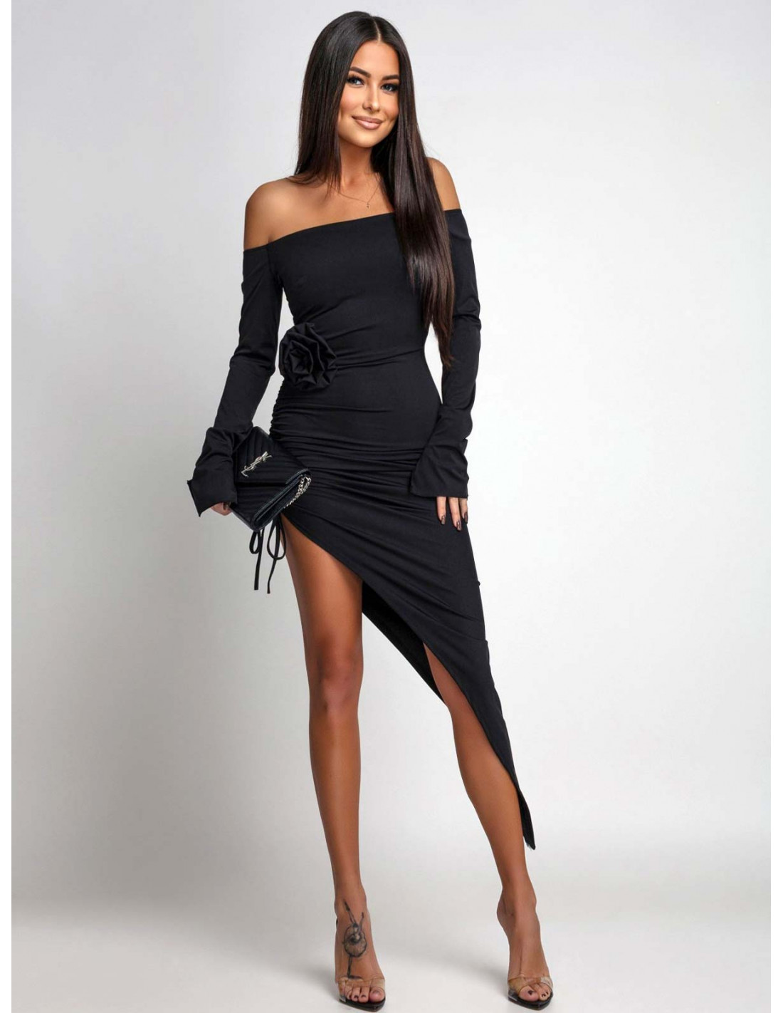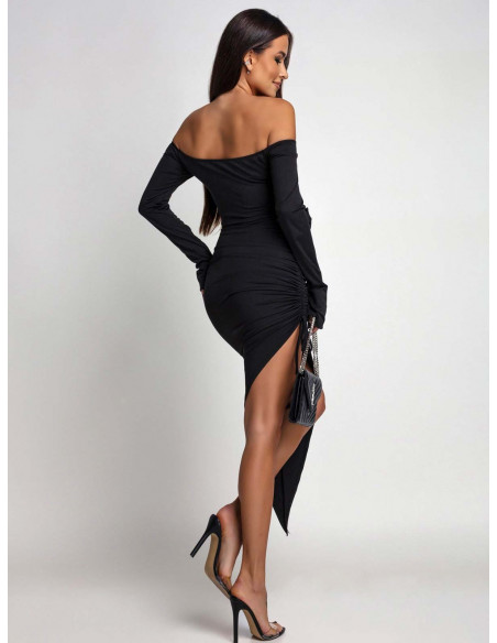 Ta czarna sukienka z odkrytymi ramionami to esencja elegancji i zmysłowego stylu w jednym.