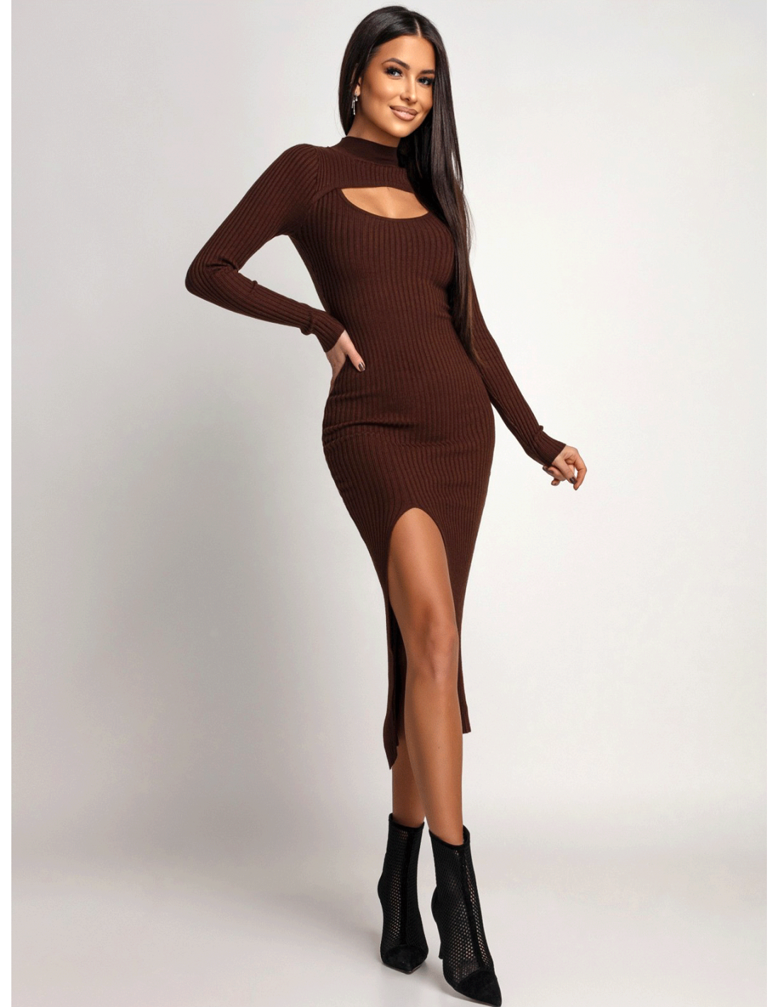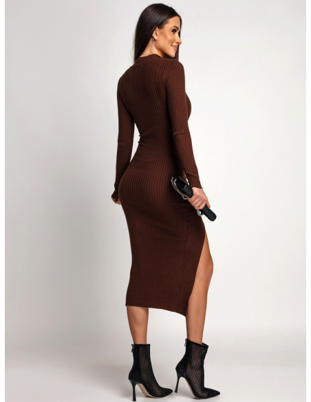 Prążkowana sukienka z wycięciem na dekolcie ARIE - czekoladowa