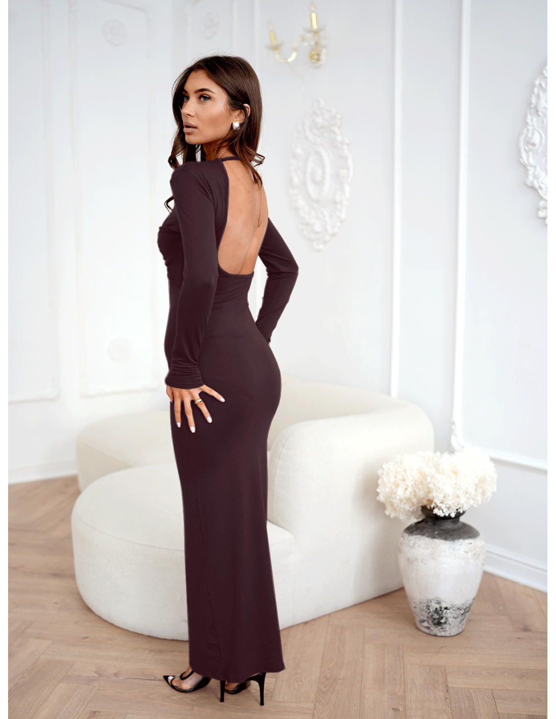 Maxi sukienka z odkrytymi plecami LORETA - czekoladowa
