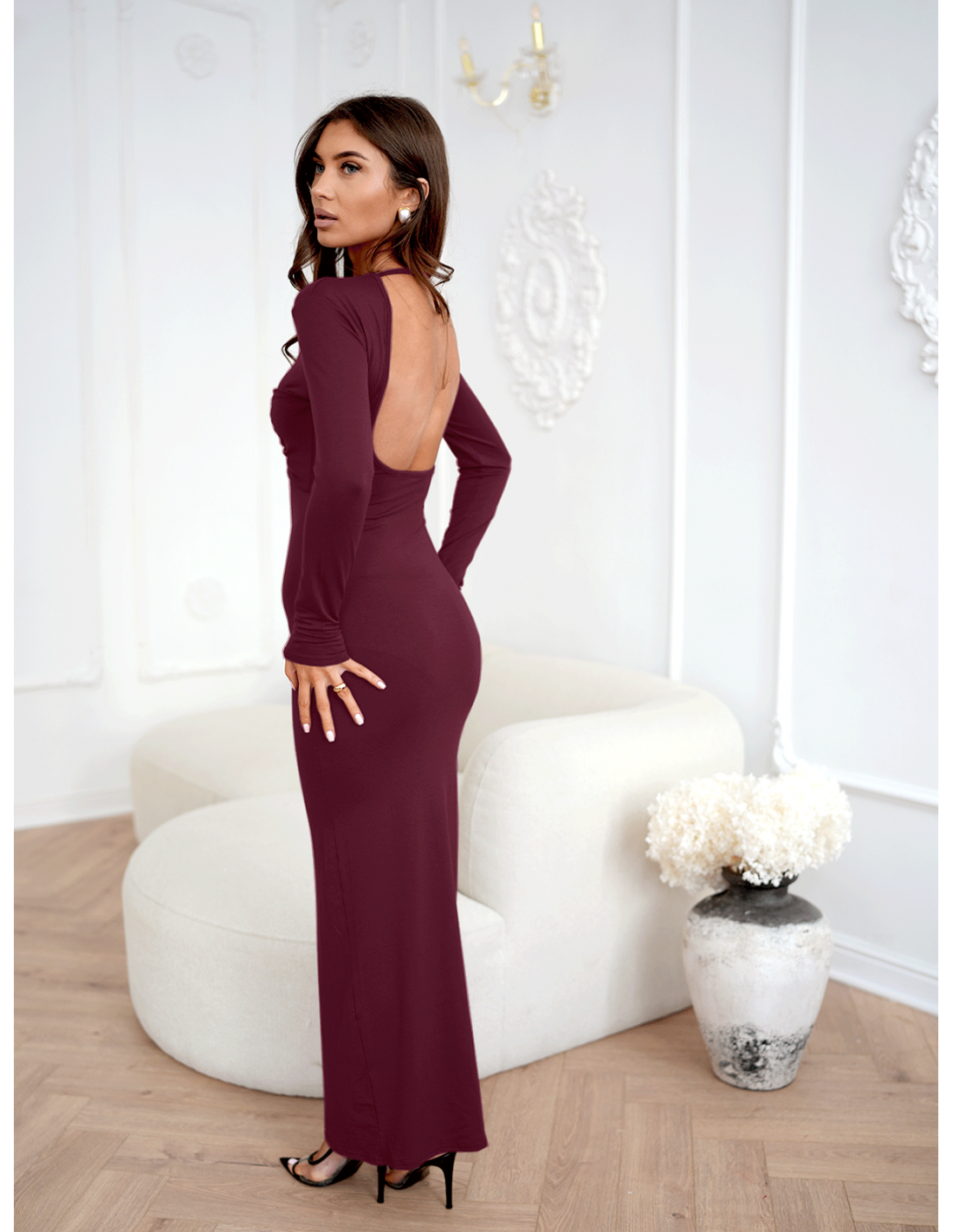 Długie rękawy oraz zabudowany przód tworzą perfekcyjną równowagę z efektownym, głębokim wycięciem na plecach.