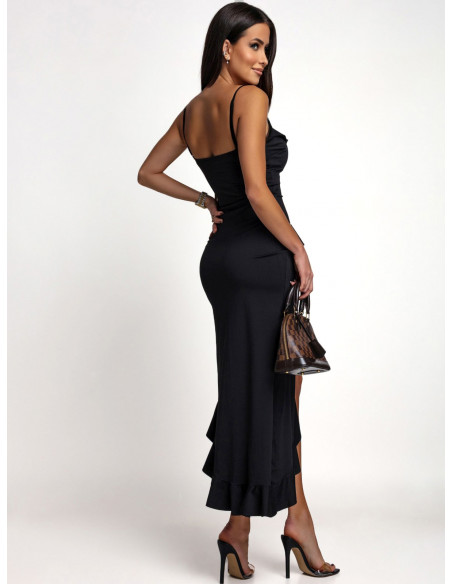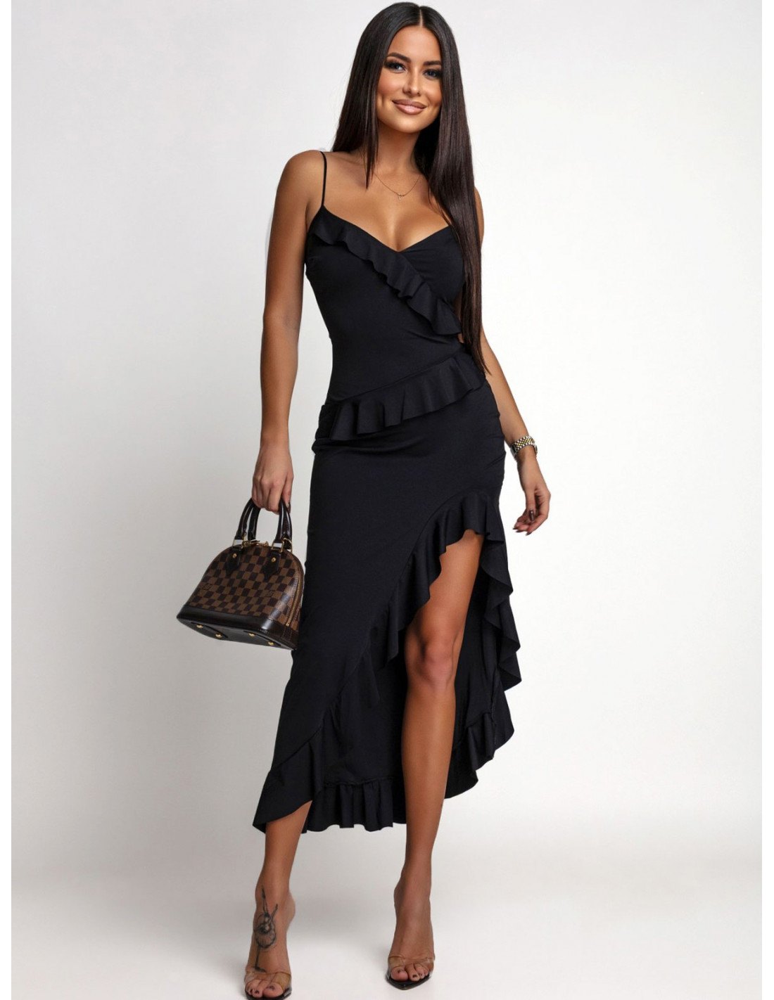 W dopasowanej maxi sukience z falbanami w kolorze czarnym poczujesz się jak gwiazda wieczoru.