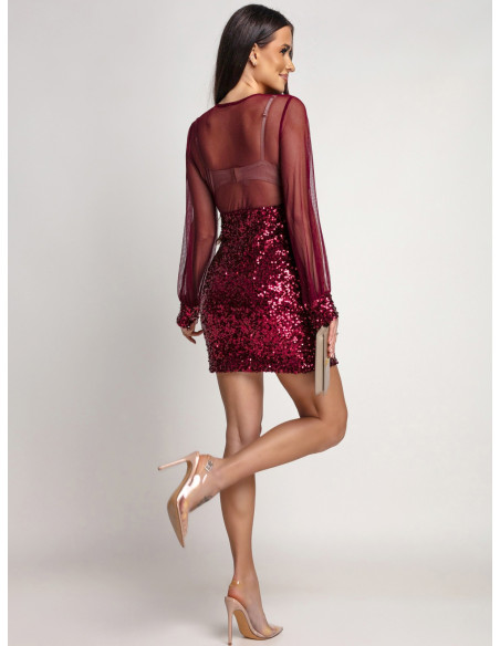 Cekinowa sukienka mini z tiulem SEVANNA - bordowa