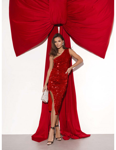 Cekinowa sukienka midi na jedno ramię SERENI - czerwona