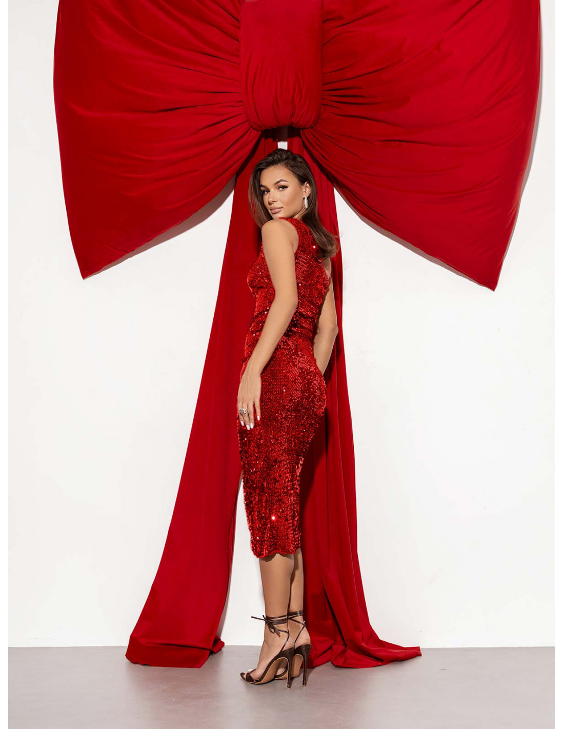 W tej czerwonej sukience naprawdę błyszczysz – bez zbędnych dodatków.